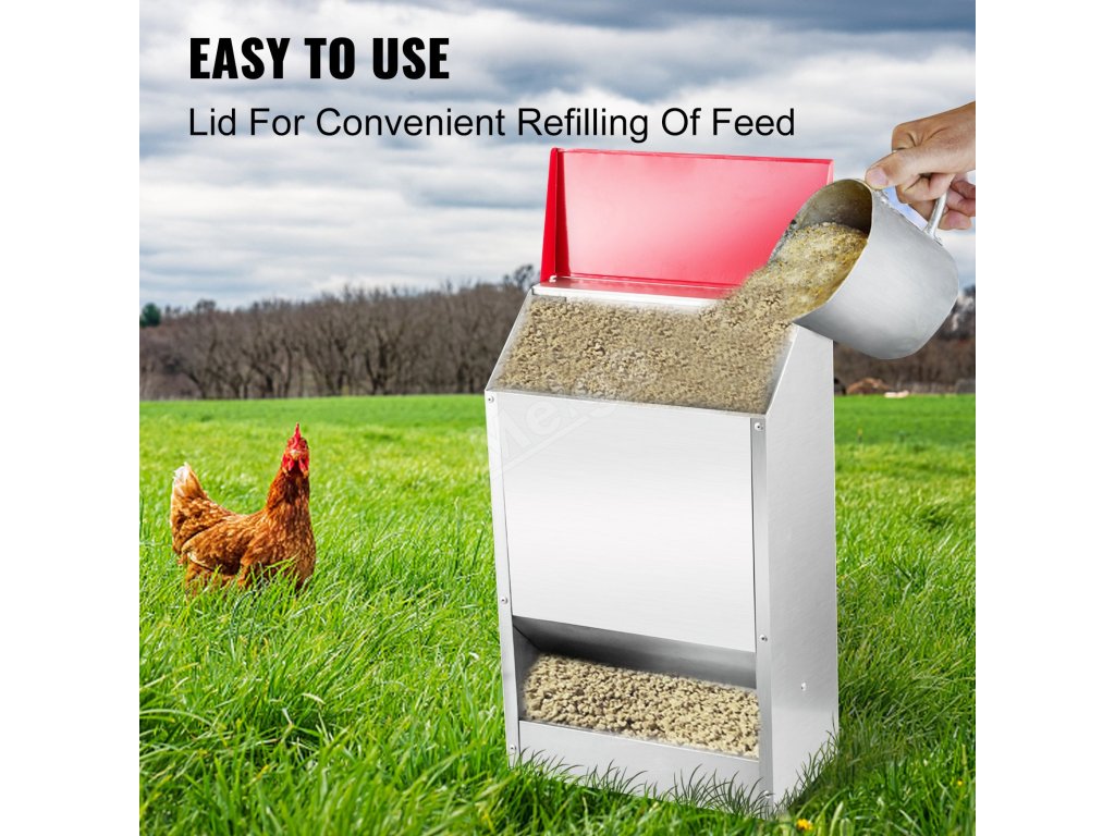 Kapacita krmítka pro drůbež je 50 liber, což snižuje počet případů, kdy musíte do krmítka přidávat krmivo. Krmítko je ideální pro kuřata, křepelky, kachny a další domácí ptactvo.