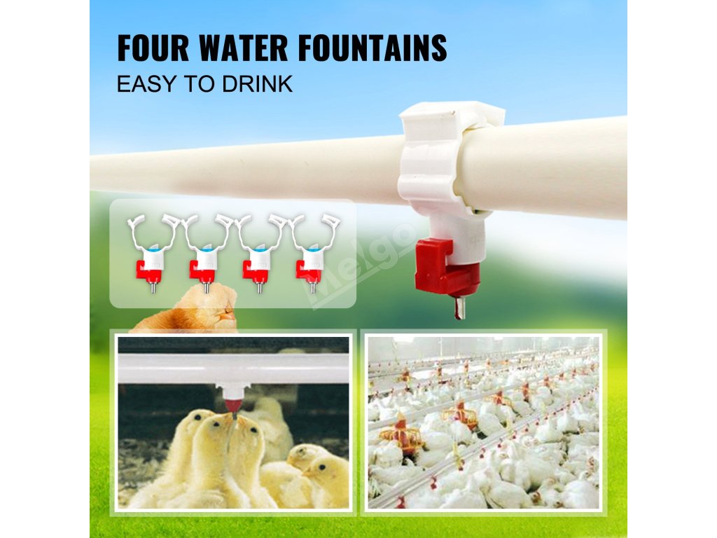 Naše automatické bezodpadové krmítko pro drůbež se dodává také se čtyřmi fontánkami na vodu, které usnadňují kuřatům pití a nevyžadují žádnou montáž, což vám ušetří spoustu času a energie.