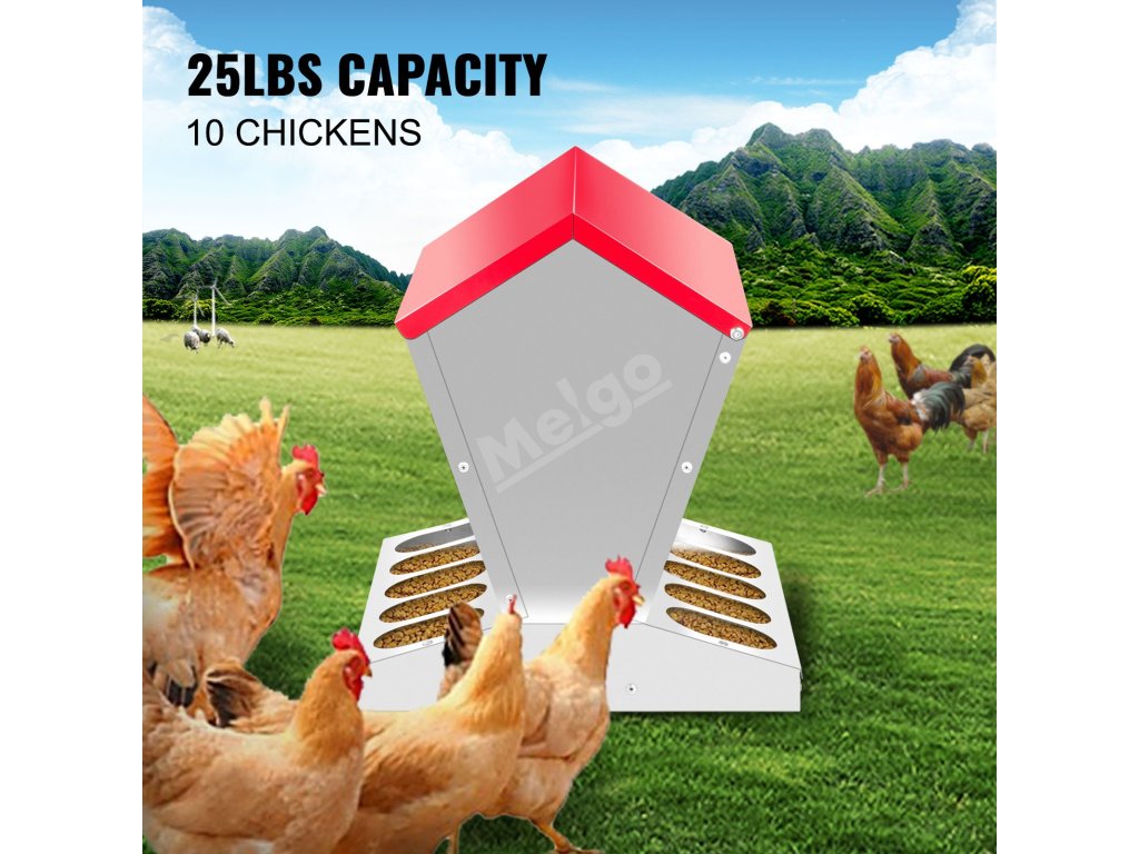 Naše kovové krmítko pro kuřata má deset krmných míst a můžete krmit deset kuřat najednou. Kapacita našeho krmítka je 25 kg, což je dostatečně velká kapacita pro krmení kuřat.