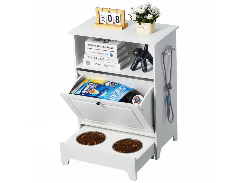 Tento vyvýšený stojan na misky pro psy se čtyřvrstvou skříňkou a 2 háčky nabízí dostatek úložného prostoru pro potřeby pro domácí mazlíčky, dekorace a knihy.
