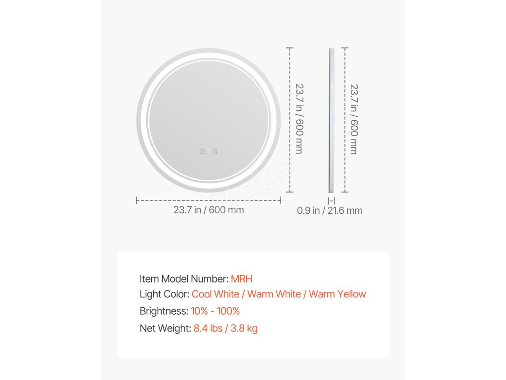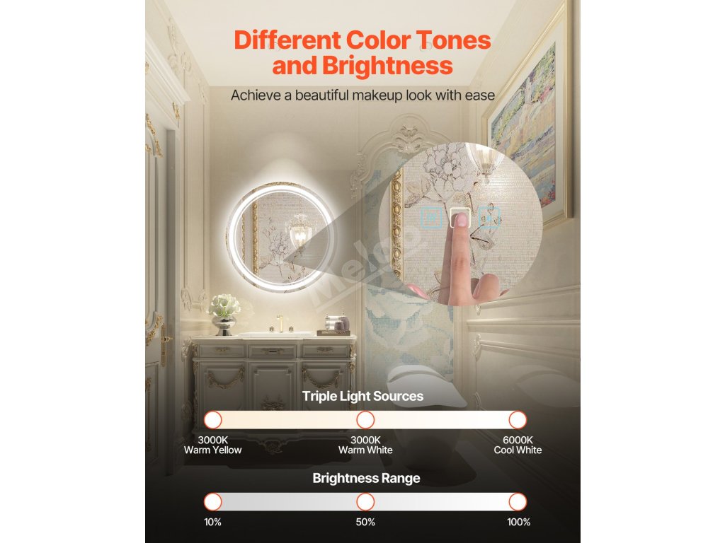 Toto koupelnové zrcadlo s led osvětlením simuluje různé světelné atmosféry a umožňuje přepínat mezi studenou bílou, teplou bílou a teplou žlutou barvou a vytvořit tak dokonalé osvětlení pro přirozené líčení. Bez námahy splňuje potřeby osvětlení pro různé příležitosti.