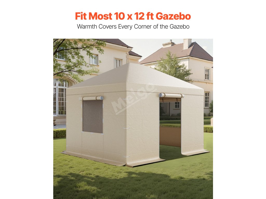 Tento univerzální kryt zimního altánu je vybaven 9,84"/25 cm zemní lištou s kovovými průchodkami pro upevnění základny. Zesílené vázací popruhy obepínají sloupky, zatímco 1,5 palce / 3,8 cm silné háčky a smyčky zajišťují panely dohromady pro větší odolnost proti větru a stabilitu.
