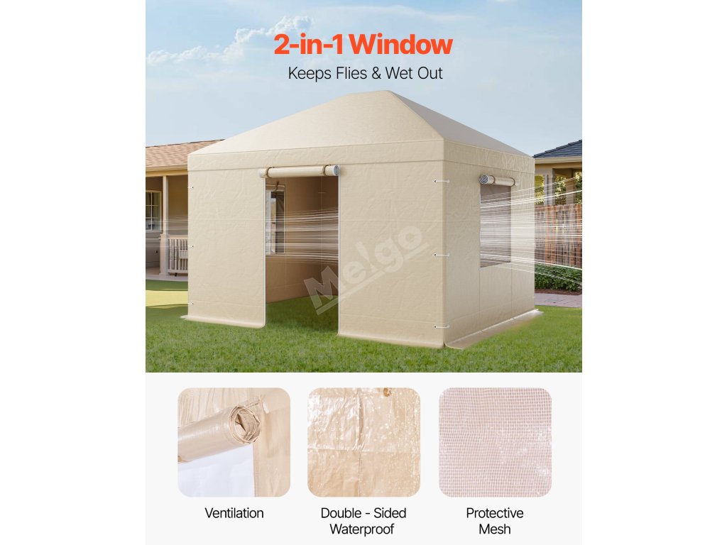 Prostorné dveře o průměru 41,34 palce/1050 mm a dvě velká okna o rozměrech 3,44 x 3,44 stopy (1,05 x 1,05 m) jsou vybaveny rolovacími síťovými panely, které udržují proudění vzduchu, jasné přirozené světlo a suchý, pohodlný interiér.
