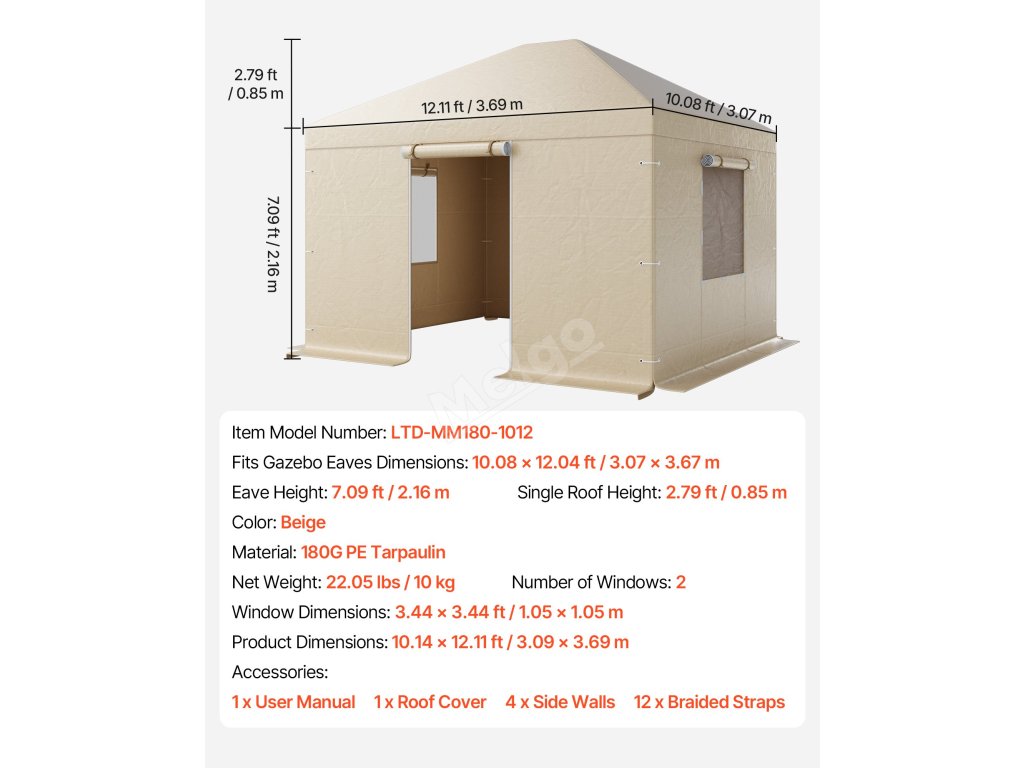 | Vhodné pro rozměry okapů altánů | 10.08 × 12,04 ft / 3,07 × 3,67 m |