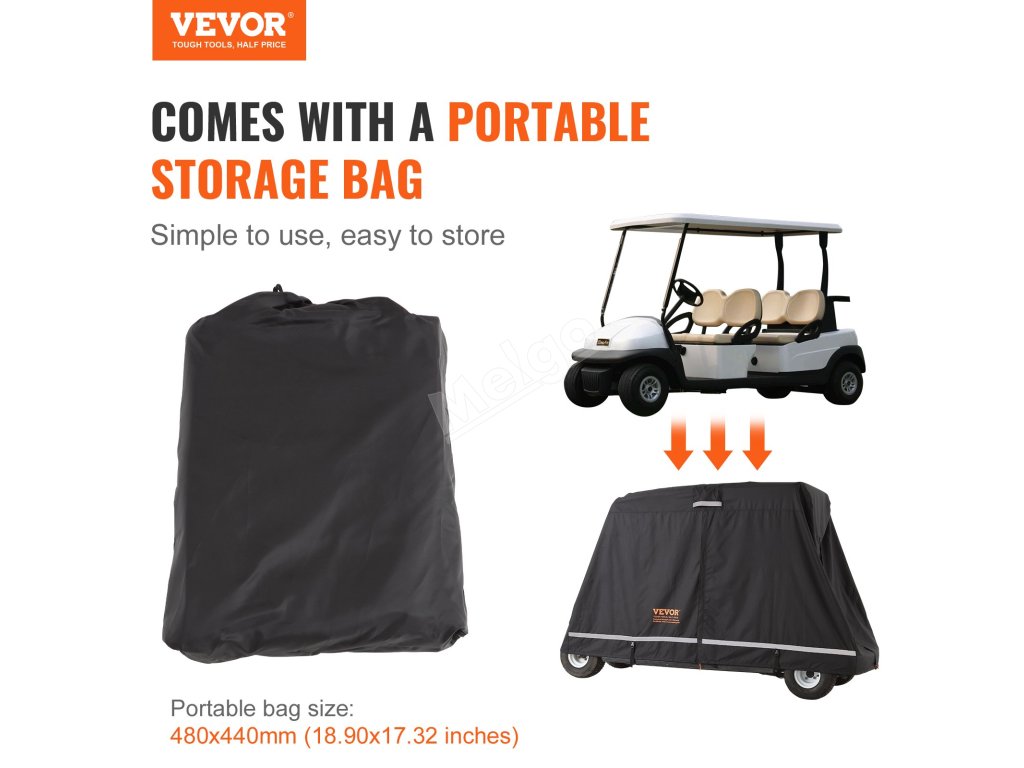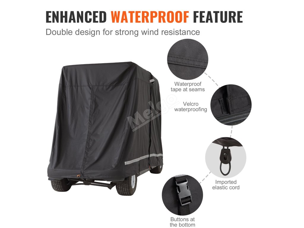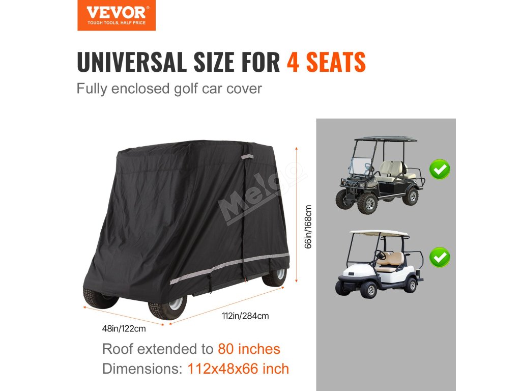 Tento kryt golfového vozíku s prodlouženou střechou do 80 palců je univerzálně vhodný pro 2 nebo 4místná vozidla Yamaha, EZGO a Club Car včetně vozíků 2+2 se zadními sklopnými sedadly. Poskytuje komplexní ochranu díky své plně uzavřené, vodotěsné a prachotěsné konstrukci.