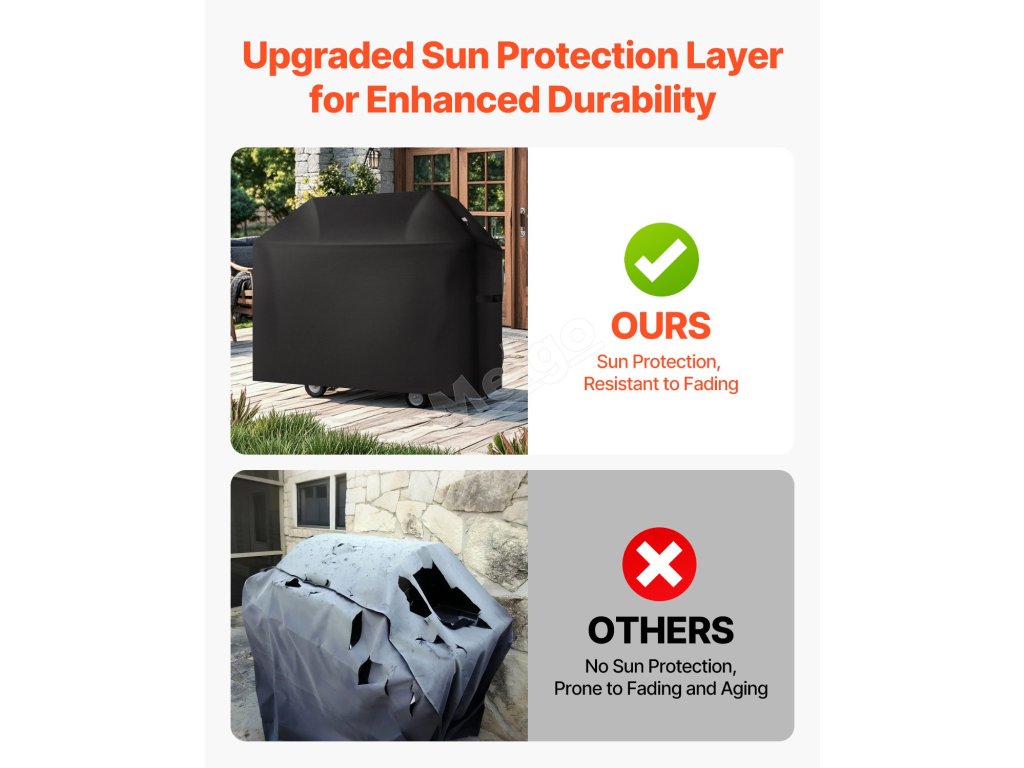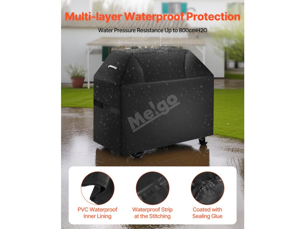 Vyrobeno ze 3 vrstev vysoce kvalitních materiálů: vrstva PVC, vrstva polyesterových vláken a nepromokavá vrstva. Tento kryt grilu zajišťuje odolnost proti vodě. Čtyři rohy jsou zesíleny, aby odolaly opotřebení. Šití je pevně utkáno, aby se zvýšila vodotěsnost.