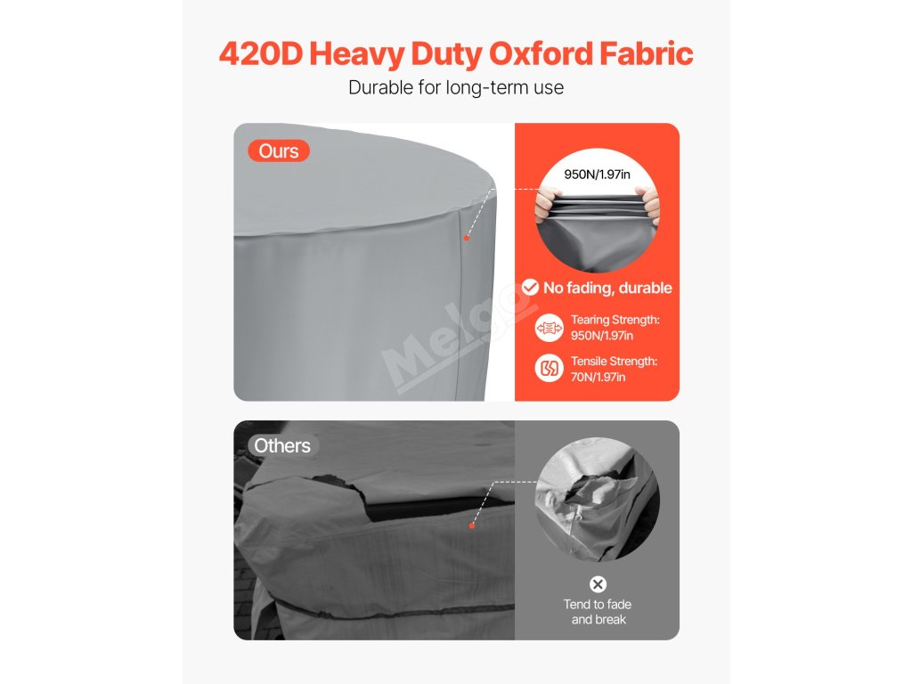 Tento kryt na venkovní vířivku je vyroben ze zesílené tkaniny Oxford 420D s pevností v roztržení 950 N/1,97 palce. Může se pochlubit výhodami, jako je odolnost proti opotřebení, odolnost proti roztržení, proti stárnutí a proti deformaci.