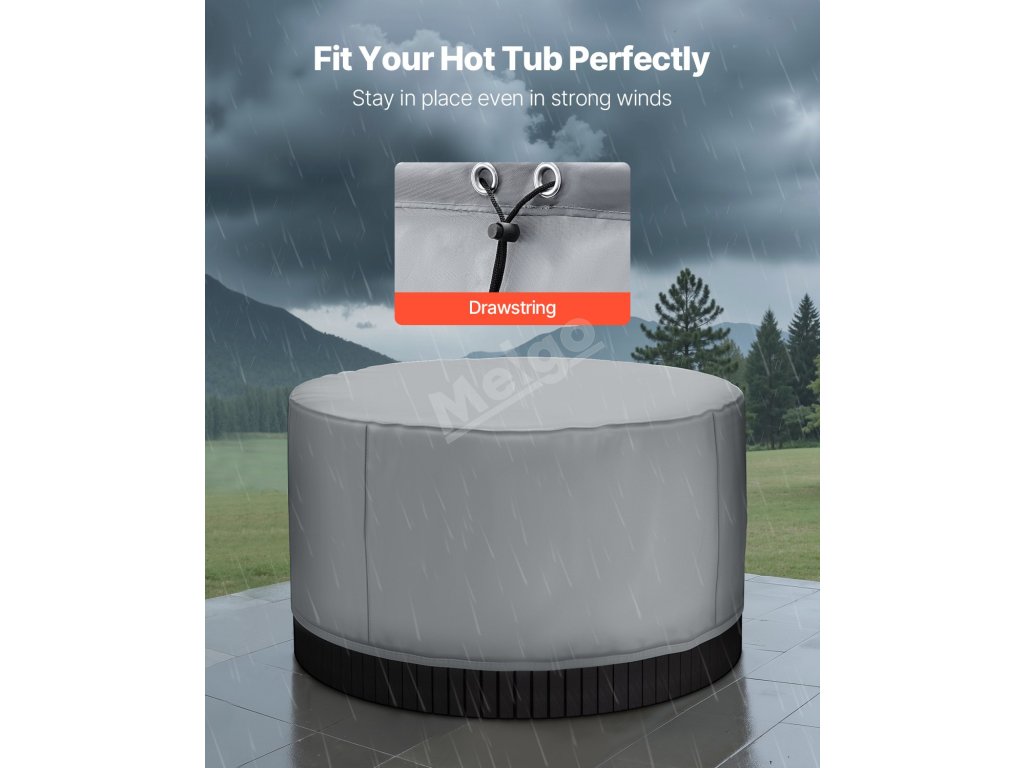 Silná tkanina v kombinaci se stahovací šňůrkou ve spodní části zajišťuje bezpečné uchycení i při silném větru a udržuje ochranný kryt vířivky pevně na místě.