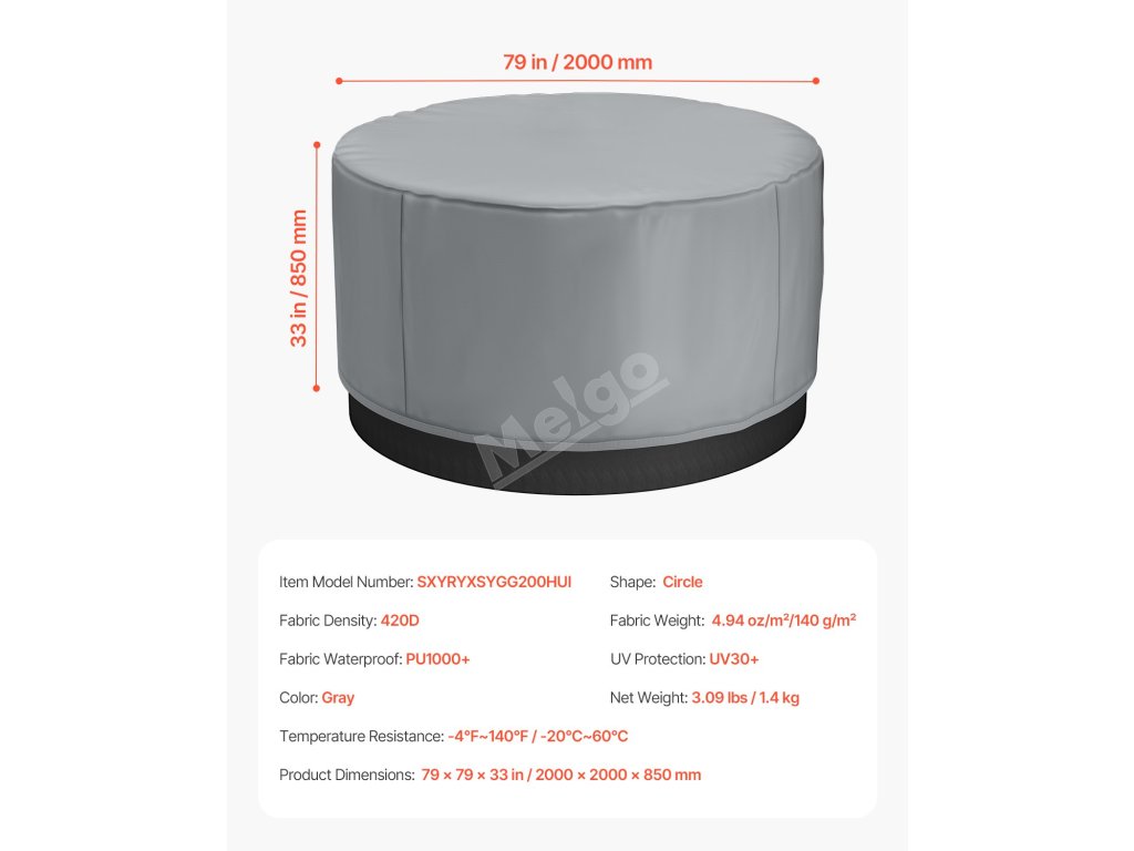 Náš kryt na vířivku o rozměrech 79 "D x 33 "V (2000D x 850H mm) je určen pro venkovní použití. Upozornění: Před objednáním nezapomeňte změřit průměr vaší vířivky, abyste se ujistili, že správně sedí.