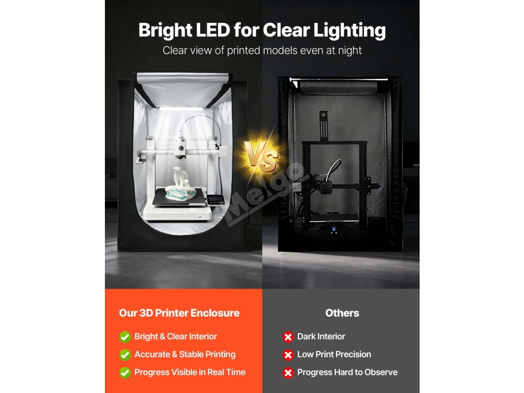 Díky tomu, že náš kryt tiskárny obsahuje LED světlo, můžete sledovat proces tisku i v noci. Průhledné okno umožňuje sledování v reálném čase, zatímco zip zajišťuje snadné otevírání a zavírání. Jeho vyhrazené otvory pro napájecí a datové kabely zajišťují čisté a krásné zapojení.