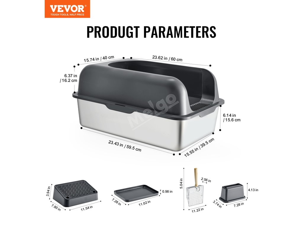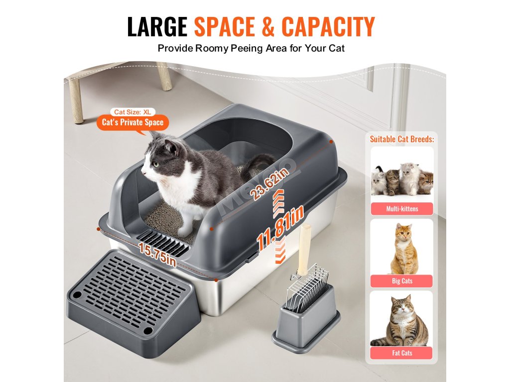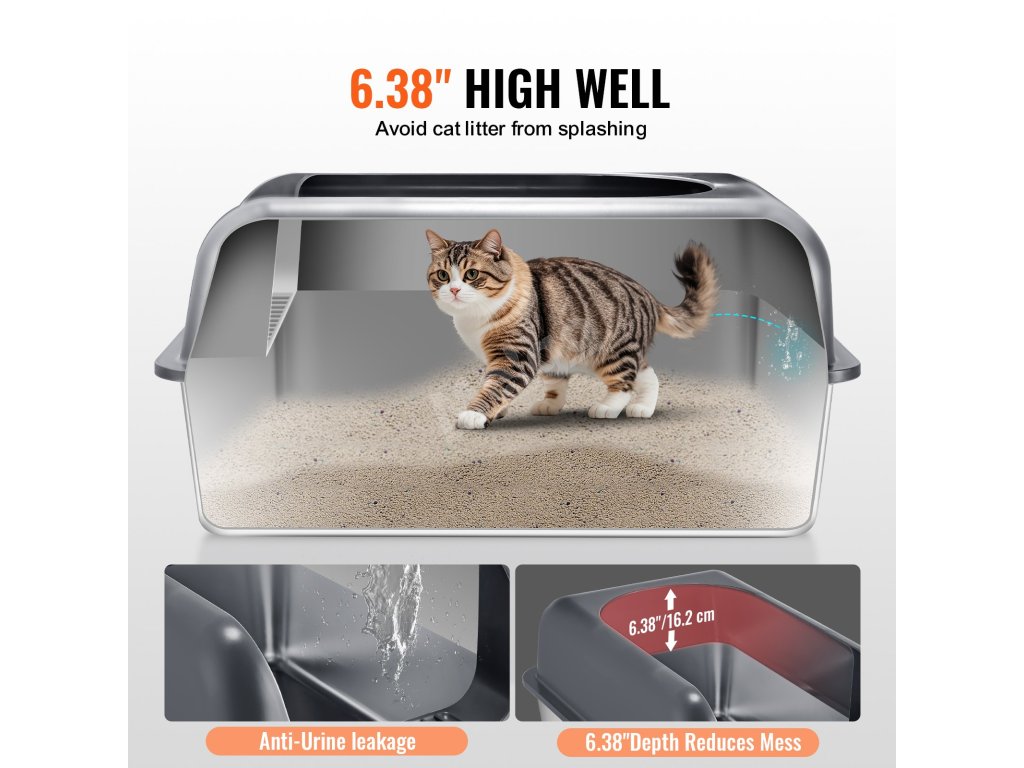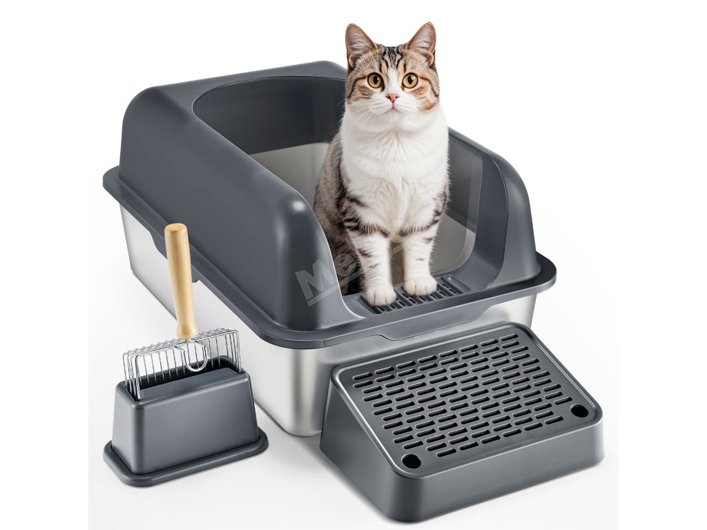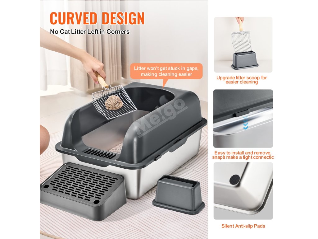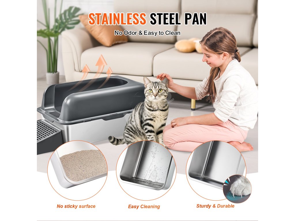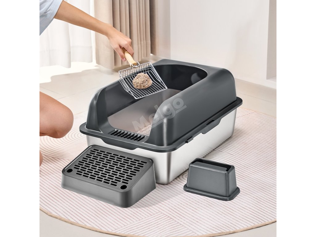 Tento box na kočičí stelivo je vyroben z nerezové oceli odolné proti opotřebení, kterou není snadné poškrábat a lze ji ihned umýt. Čtyři protiskluzové nožičky mezitím zajišťují, že je box na stelivo stabilní a nepohybuje se, čímž udržuje prostředí čisté a bez zápachu.