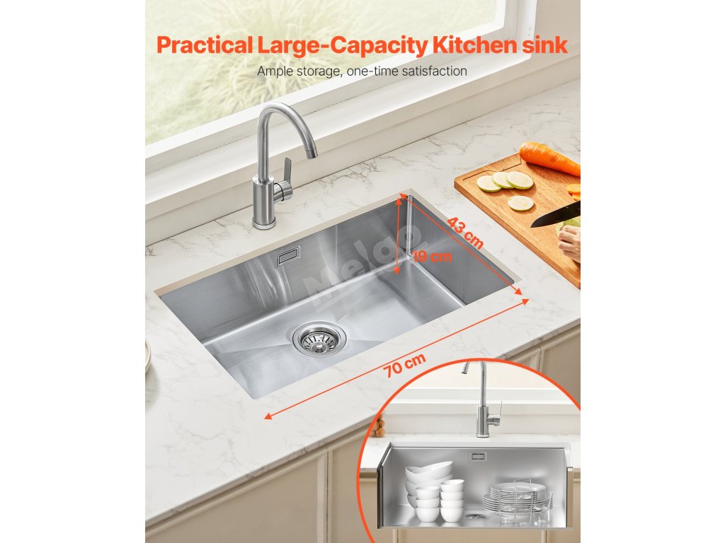 Vnější rozměry: 70x43 cm. Vnitřní rozměry: 65x38 cm. Extra hloubka 19 cm je ideální pro mytí velkého kuchyňského náčiní. Jeho moderní design zaručuje dlouhodobé používání v rušné kuchyni. Před nákupem si ověřte, zda se vejde na vaši kuchyňskou linku.
