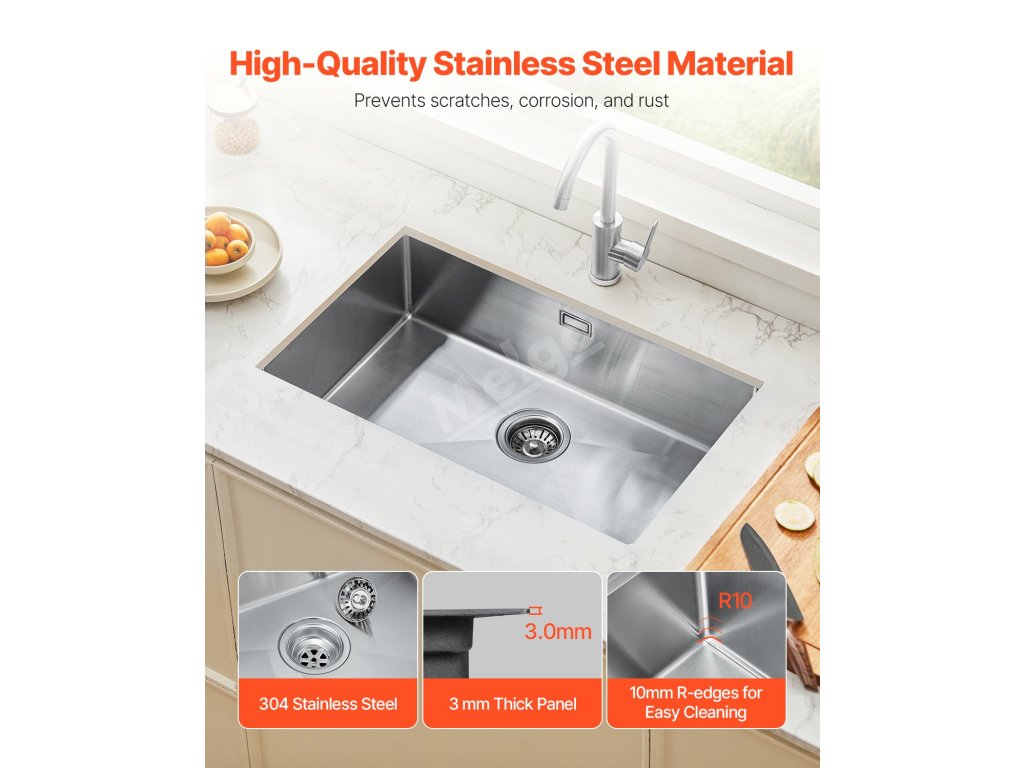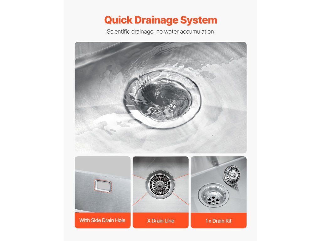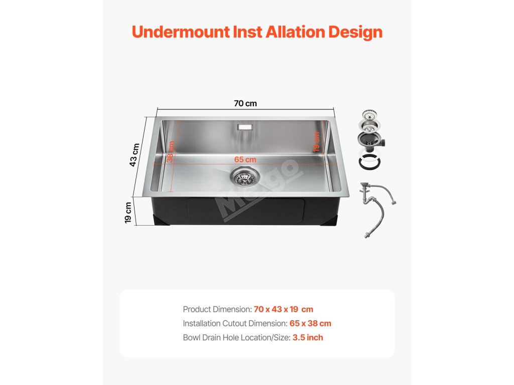 Podstavný barový dřez se snadno instaluje a nevyžaduje žádné větší úpravy kuchyňských skříněk nebo desky. Mimořádně silný okraj z nerezové oceli 304 o tloušťce 3 mm umožňuje bezpečnou instalaci; silné tělo dřezu zajišťuje odolnost.