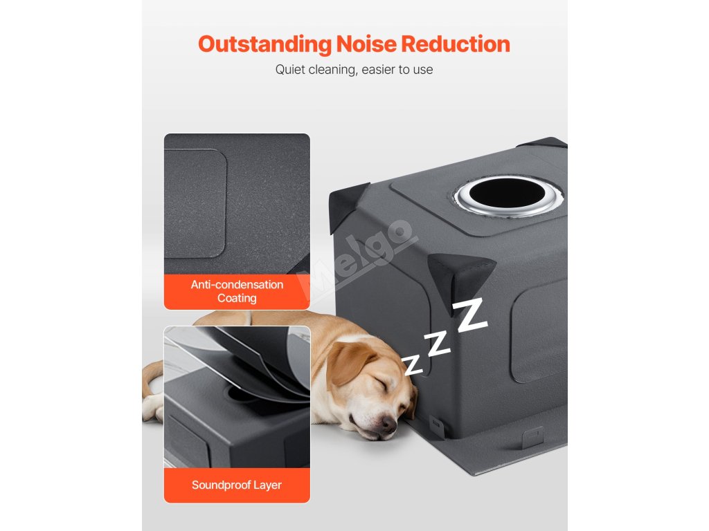 Tento zapuštěný farmářský dřez používá zvukově izolační podložky a izolační materiály základní vrstvy, které snižují hluk a zajišťují vynikající odhlučnění a tichou spolehlivost. Silný základní nátěr zabraňuje kondenzaci vodní páry.