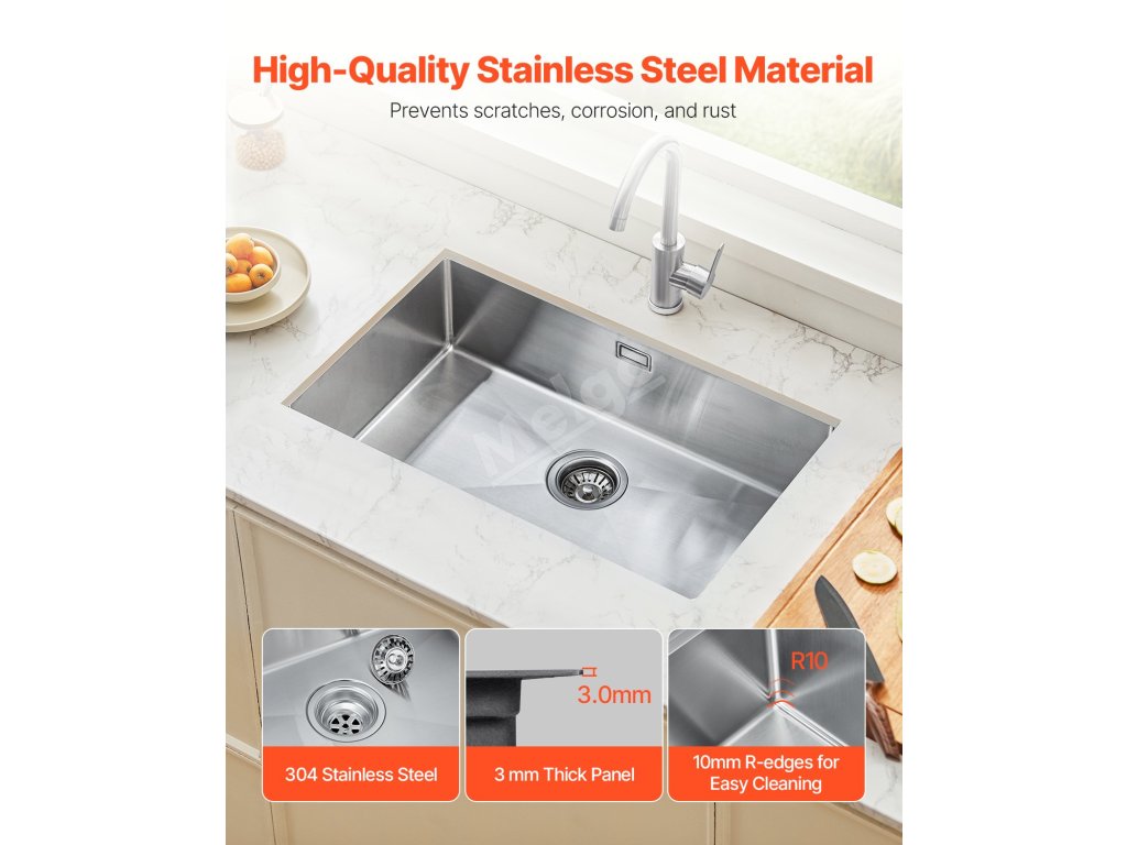 Pracovní stanice kuchyňského dřezu je vyrobena z vysoce kvalitní nerezové oceli 304, která zajišťuje odolnost proti poškrábání a skvrnám, a zpevněné oceli pro dlouhou životnost.