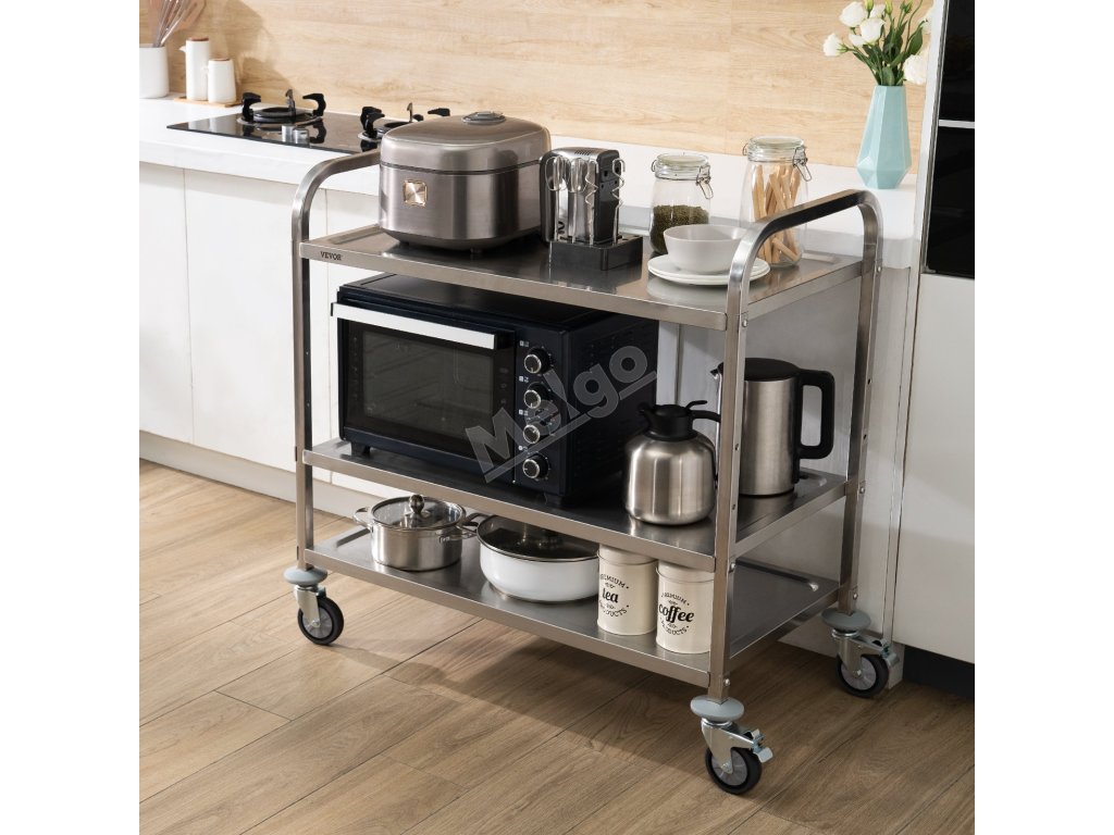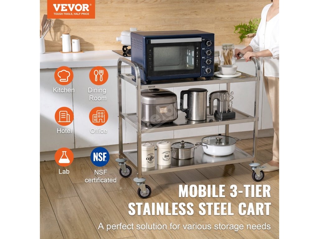 Kuchynský úžitkový vozík VEVOR je vyrobený z ocele s priemyselnou pevnosťou. Má nosnosť až 450 kilogramov. Vďaka tomu je ideálny na uskladnenie veľkých kuchynských spotrebičov. Vďaka štyrom 4-palcovým kolieskam sa veľmi ľahko premiestňuje. Rukoväť 80 mm koša a PP vložka pomáhajú udržať veci v bezpečí počas presunu.