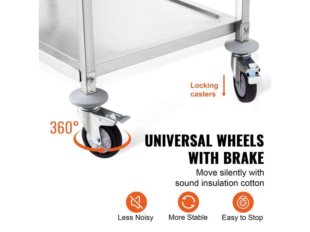 Tento kuchynský úžitkový vozík má štyri 4-palcové tiché kolieska. To zaručuje bezhlučný pohyb pri preprave predmetov. Zadný brzdový systém vozíka umožňuje spoľahlivé zastavenie. Vozík môžete bezproblémovo premiestňovať a zastavovať. Vďaka tomu sa dá ľahko používať v akomkoľvek prostredí. Bez ohľadu na to, či sa s ním pohybujete po tichej kancelárii alebo rušnej kuchyni, funguje bez problémov. Bezhlučná funkcia zaručuje, že nebudete rušiť ostatných. Spoľahlivý brzdový systém poskytuje vyššiu bezpečnosť. Tento vozík je navrhnutý na jednoduchú a plynulú prepravu.