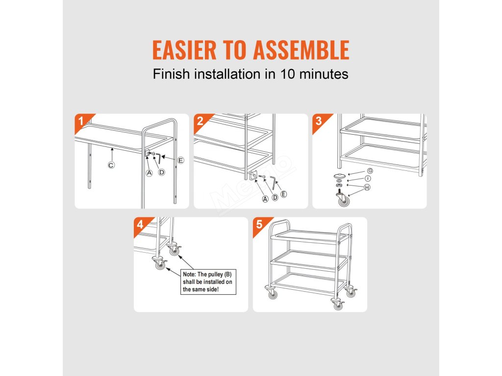 Oceľový servisný vozík VEVOR je skvelým nástrojom na jednoduchú montáž. Dodáva sa so všetkým potrebným príslušenstvom a podrobnými pokynmi. Vďaka tomu ho môžete rýchlo zostaviť. Vďaka jednoduchej montáži ho môžete začať používať ihneď. Vonkajší obal je vystužený, aby boli všetky časti neporušené. Vďaka tomu je postup montáže hladký a bezproblémový. Na jeho zostavenie nepotrebujete žiadne špeciálne nástroje ani zručnosti. Používateľsky prívetivý dizajn nášho vozíka zaručuje, že ho dokáže zostaviť každý. Ušetrí vám to čas a námahu.