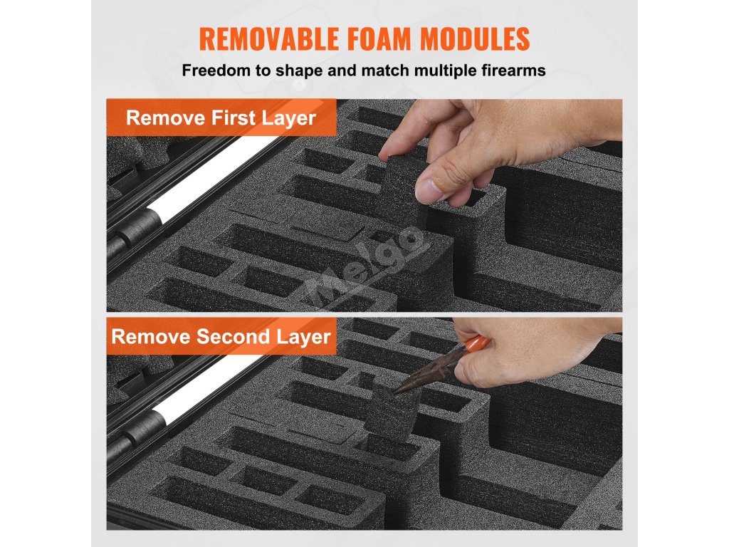 Horní kryt pevného pistolového pouzdra je vyložen pěnou ve tvaru vejce, která poskytuje dodatečnou ochranu s podšívkou XPE pro polohu střelné zbraně, zatímco spodní vrstva obsahuje ochrannou pěnu, která zajišťuje pevné uchycení střelné zbraně a zabraňuje uvolnění, poškození a poškrábání způsobenému nesprávným nastavením velikosti.