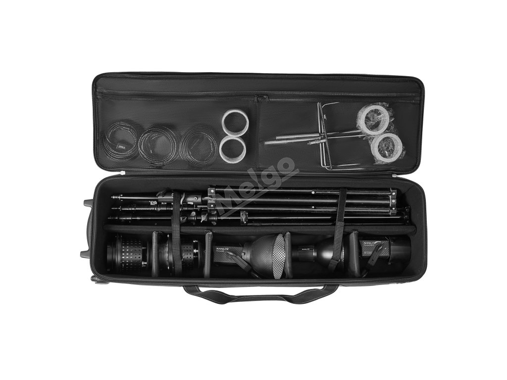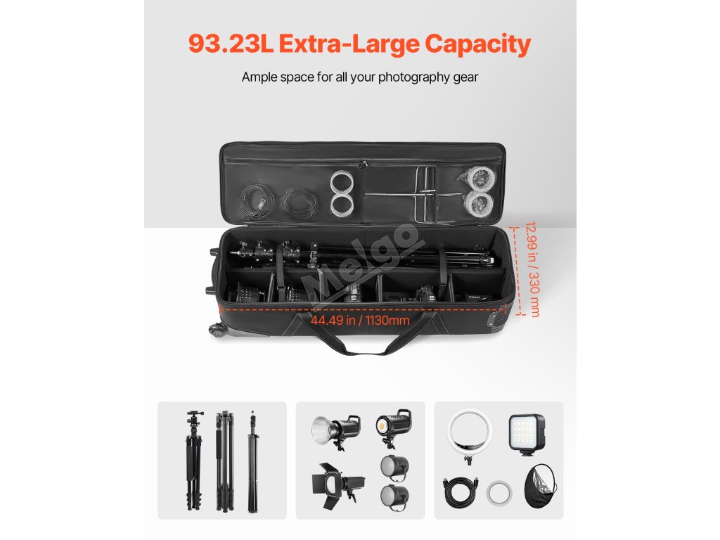 Do našeho studiového kufru na kolečkách, který je speciálně navržen pro uložení fotografického vybavení různých velikostí, snadno uložíte studiová světla, světelné stojany, deštníky s měkkým světlem a skládací reflektory. Je to ideální společník pro fotografy.