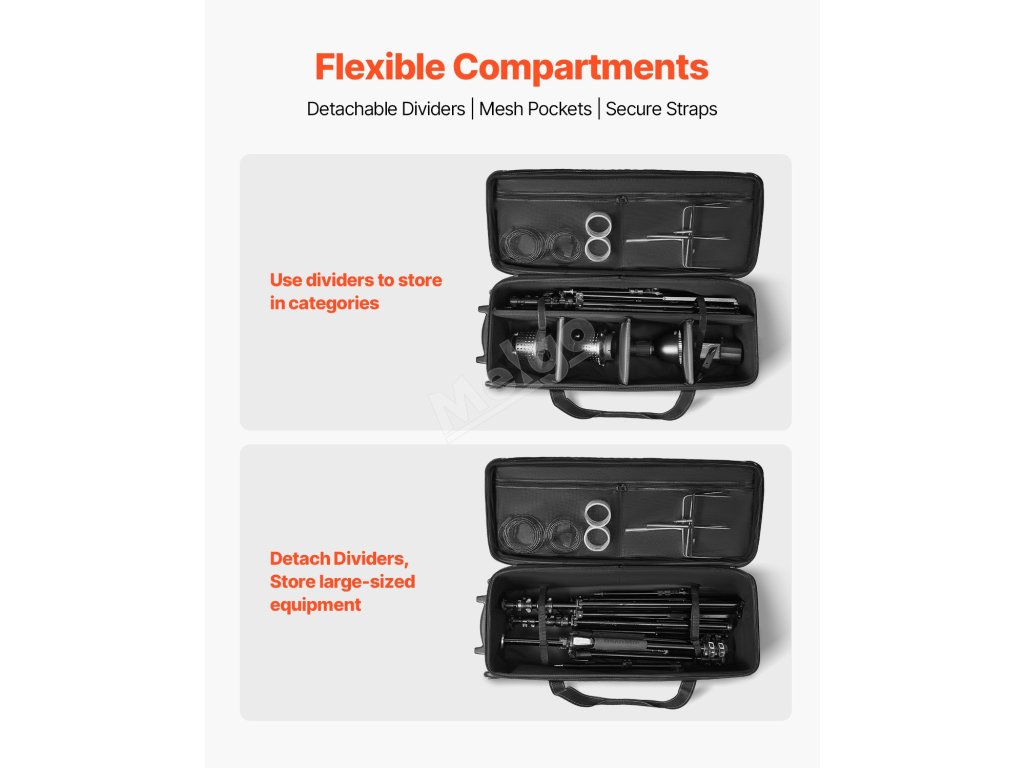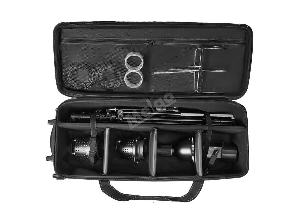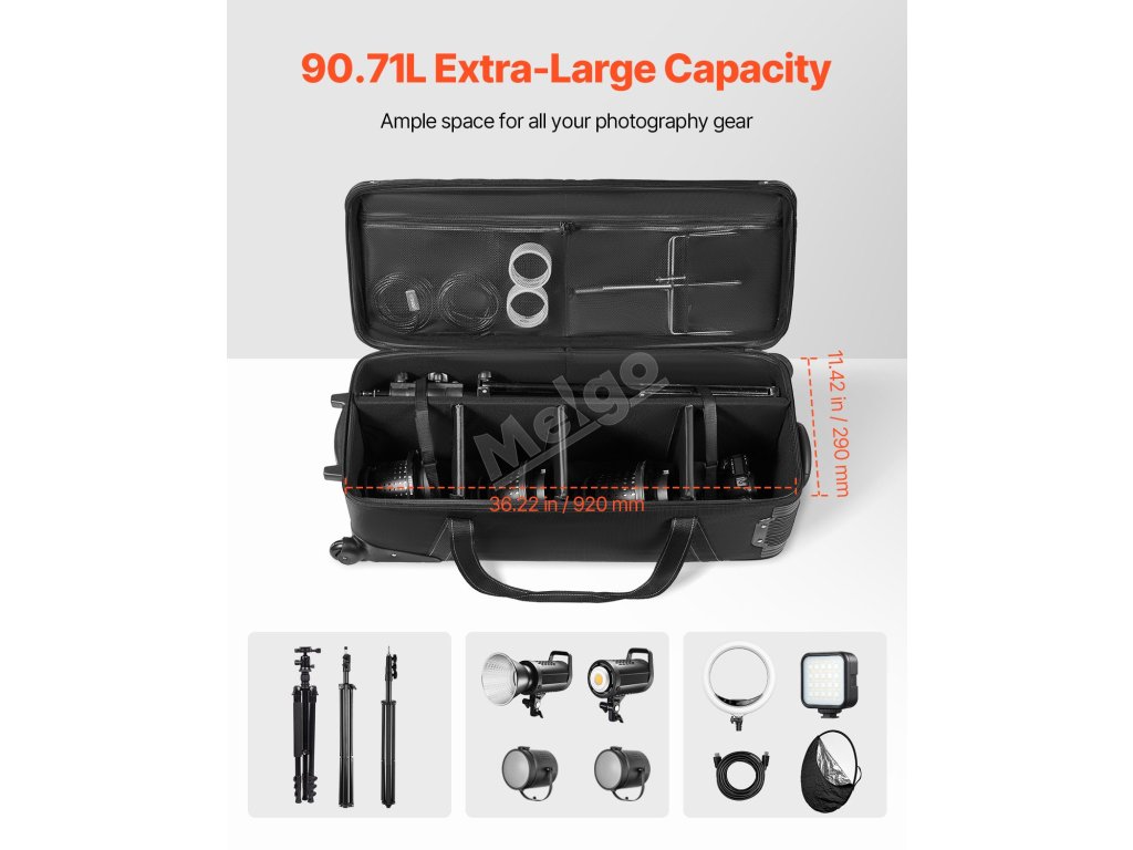 Náš studiový kufr na kolečkách je speciálně navržen pro uložení fotografického vybavení různých velikostí a snadno do něj uložíte studiová světla, světelné stojany, měkké deštníky a skládací reflektory. Je to ideální společník pro fotografy.
