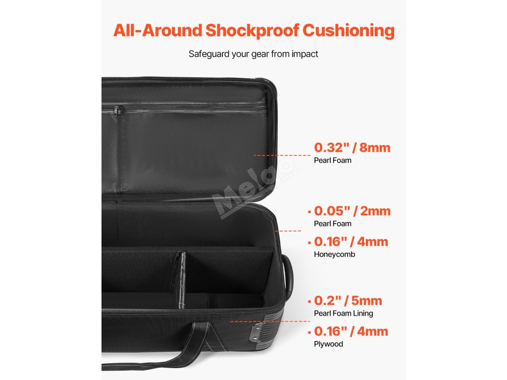 Zdrsněný vnější povrch zajišťuje odolnost proti nárazu a bezpečné popruhy zabraňují jakémukoli posunu během přepravy. Flexibilní polstrované přepážky umožňují přizpůsobitelné uspořádání a síťované kapsy usnadňují rychlý přehled a přístup k vybavení.
