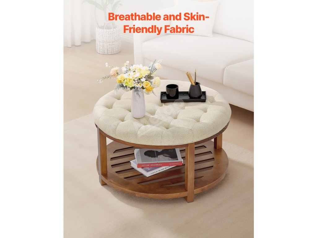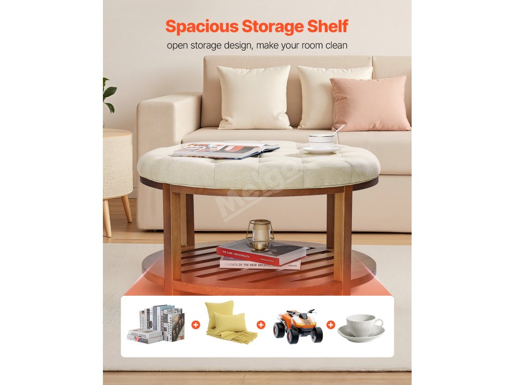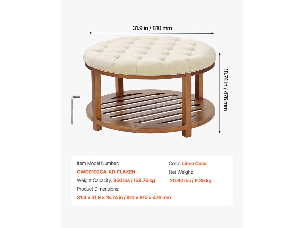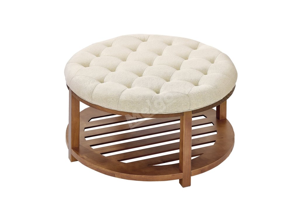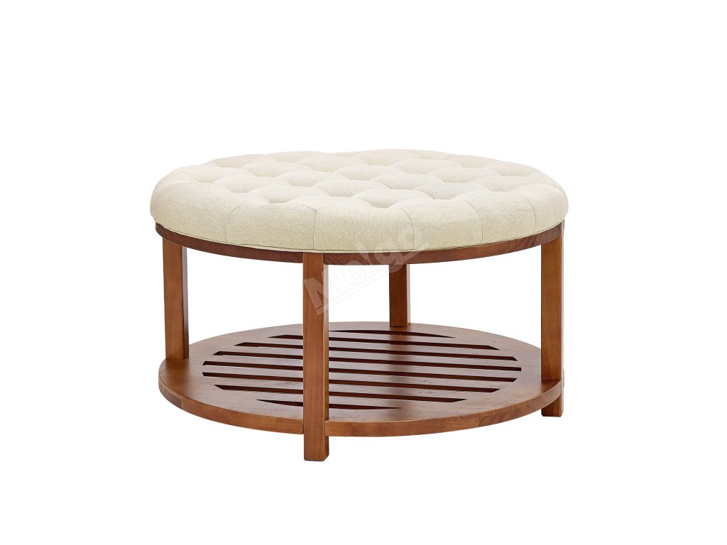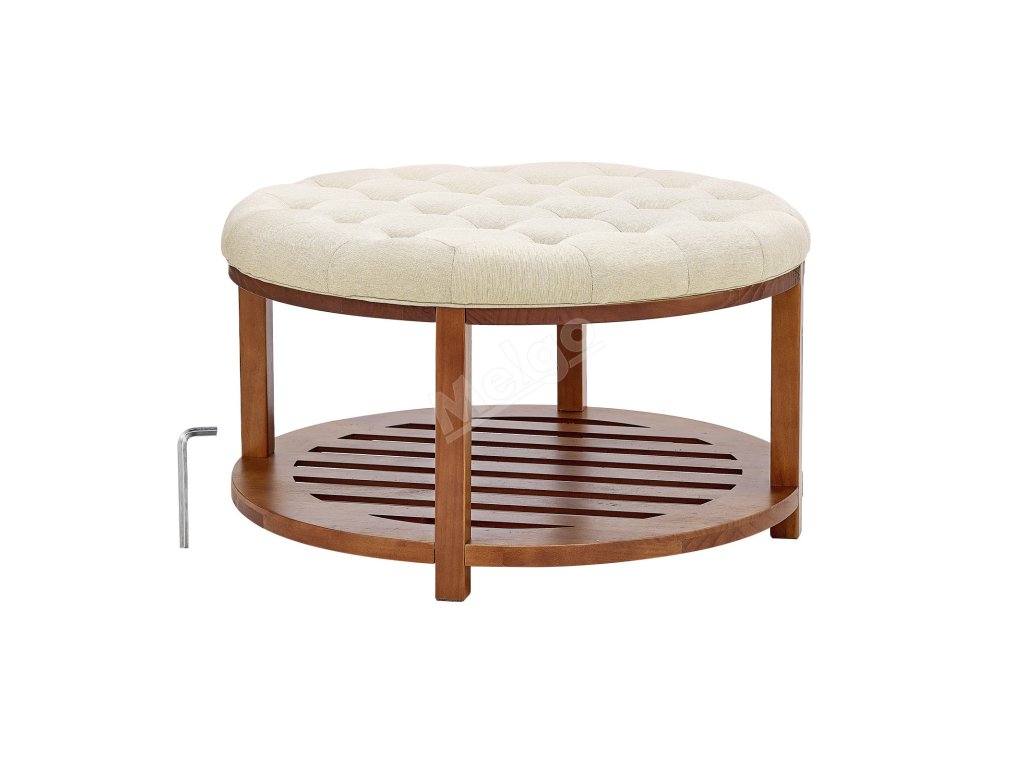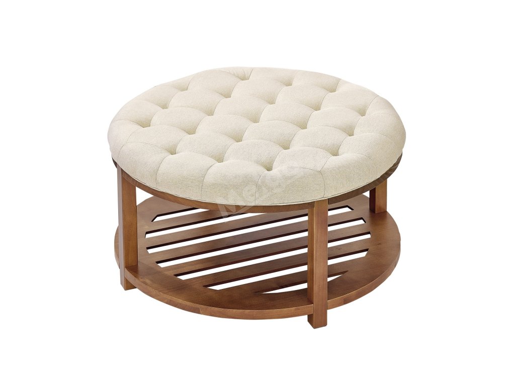 Kulatý taburet 81 cm, prošívaný, dřevěná police, lněný potah