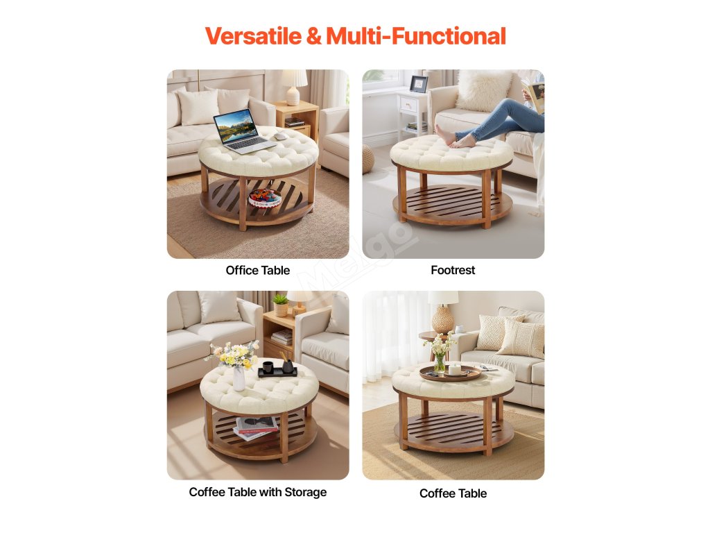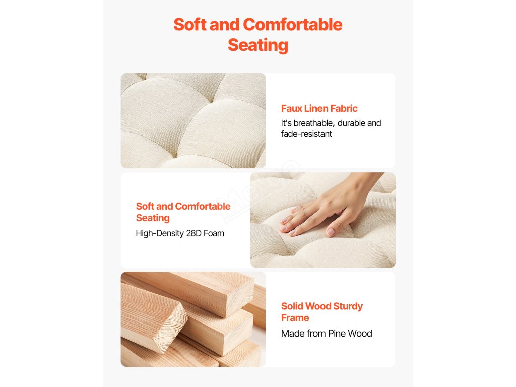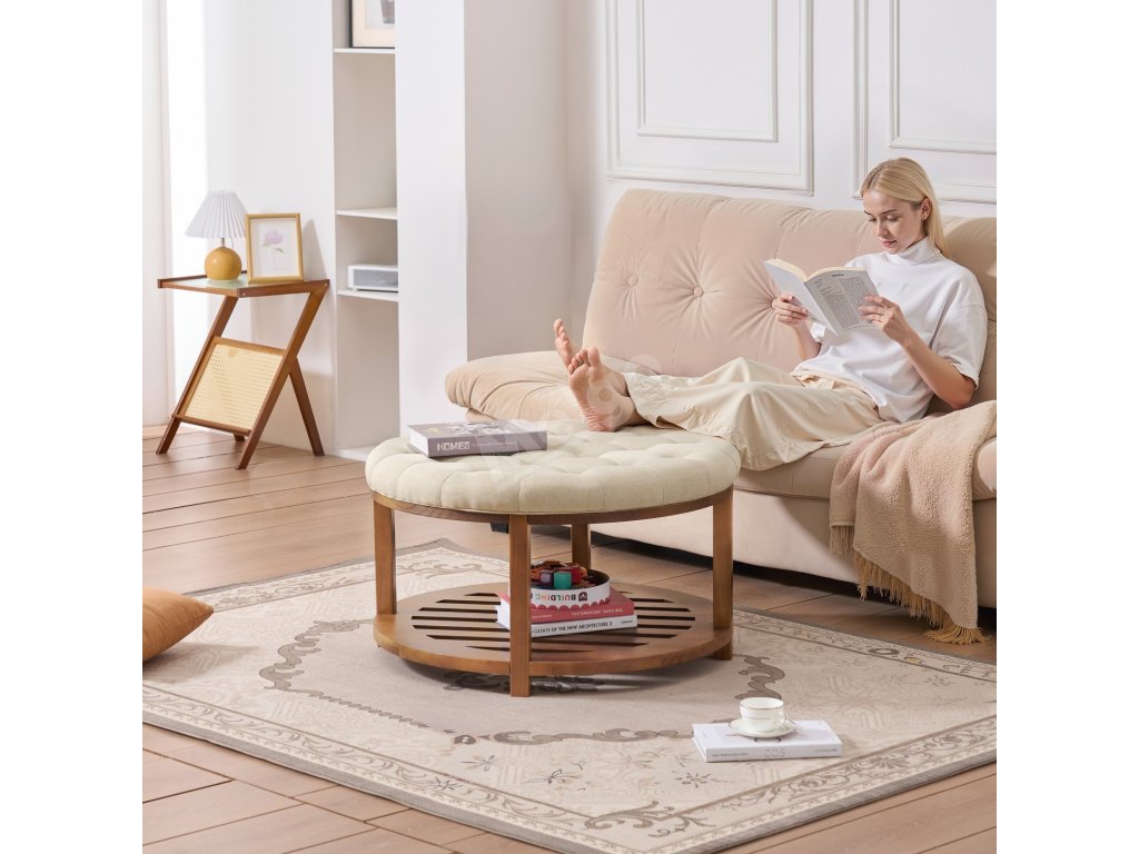 Kombinuje úložný prostor, podnožku, sedadlo a stolek a unese až 350 kg. Prodyšná lněná tkanina a silný pěnový polštář poskytují pohodlí a odolnost. Spodní dřevěný úložný prostor pro snadný přístup k hračkám, dálkovým ovladačům a dalším věcem. Ideální pro malé prostory.