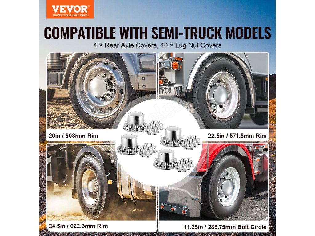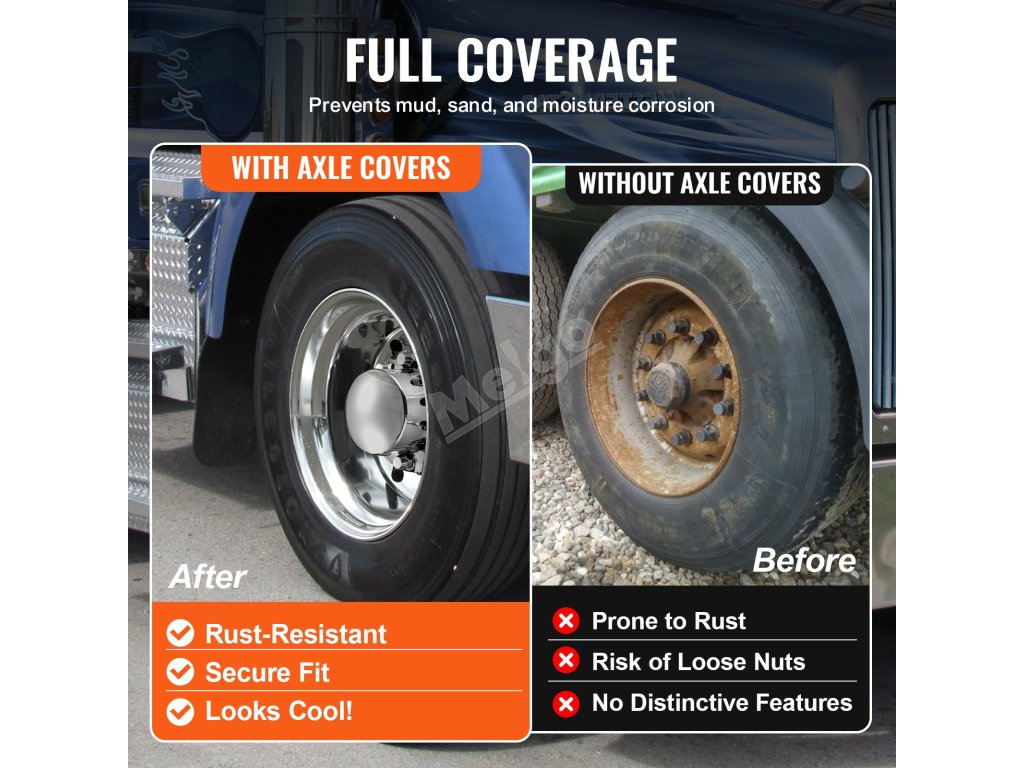 Ať už má váš nákladní vůz 20palcová, 22,5palcová nebo 24,5palcová kola nebo 11,25palcový kruh šroubů, tento kryt nápravy přívěsu dodá vašemu vozu vlastní vzhled a váš vůz na silnici vynikne.