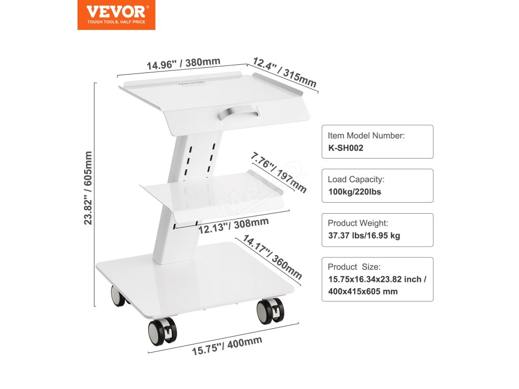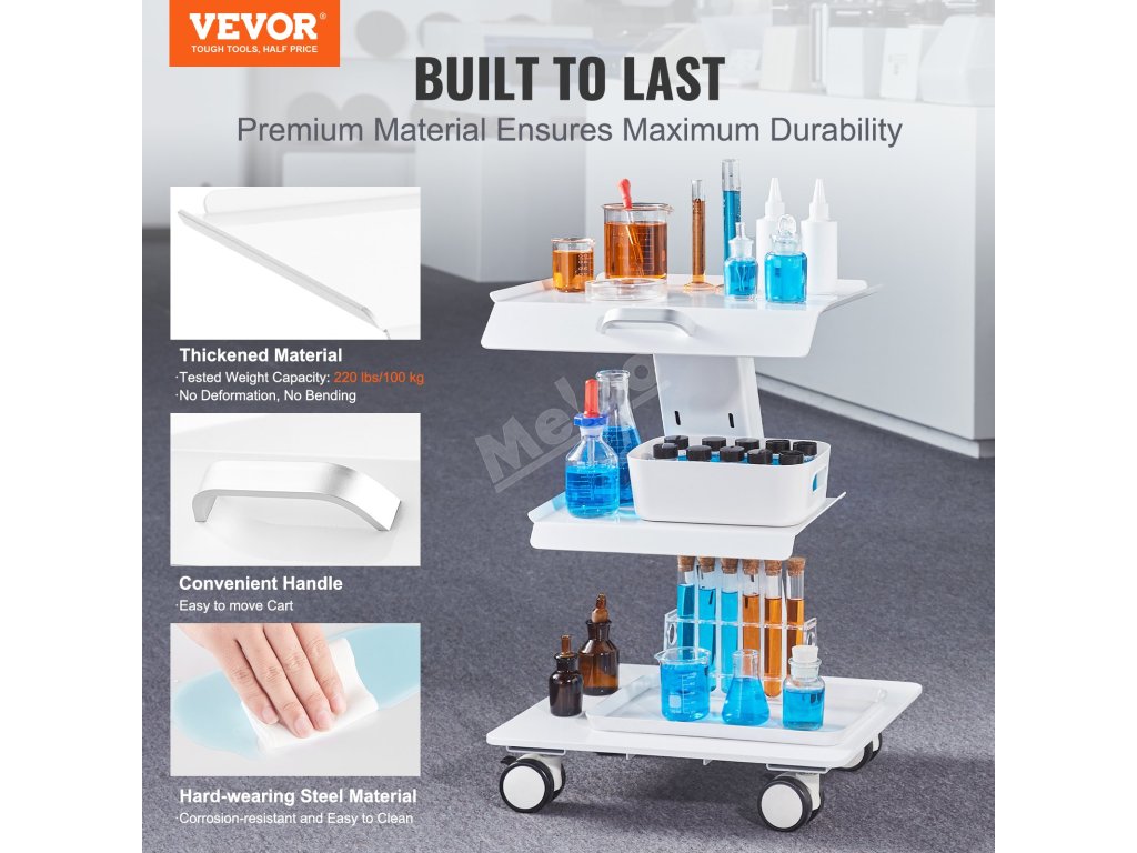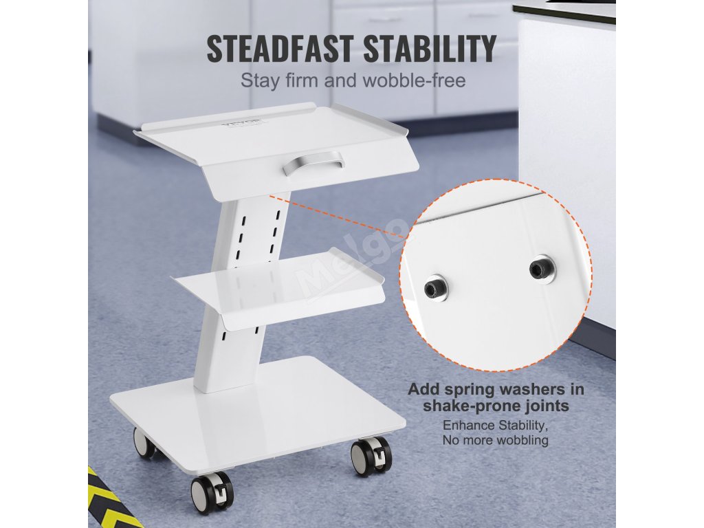 Tento laboratorní vozík je vyroben z pevné oceli, takže je stabilní, pevný a nosný, a dosahuje nosnosti 220 kg. Bíle lakovaný povrch nerezaví ani se snadno neopotřebovává.