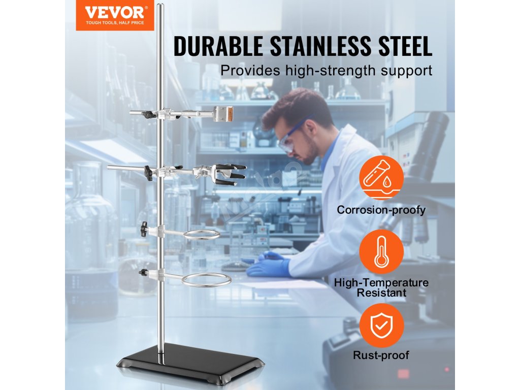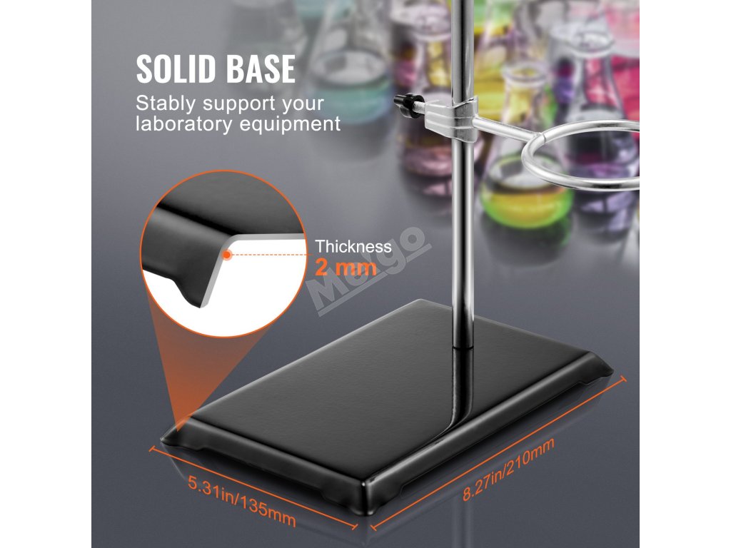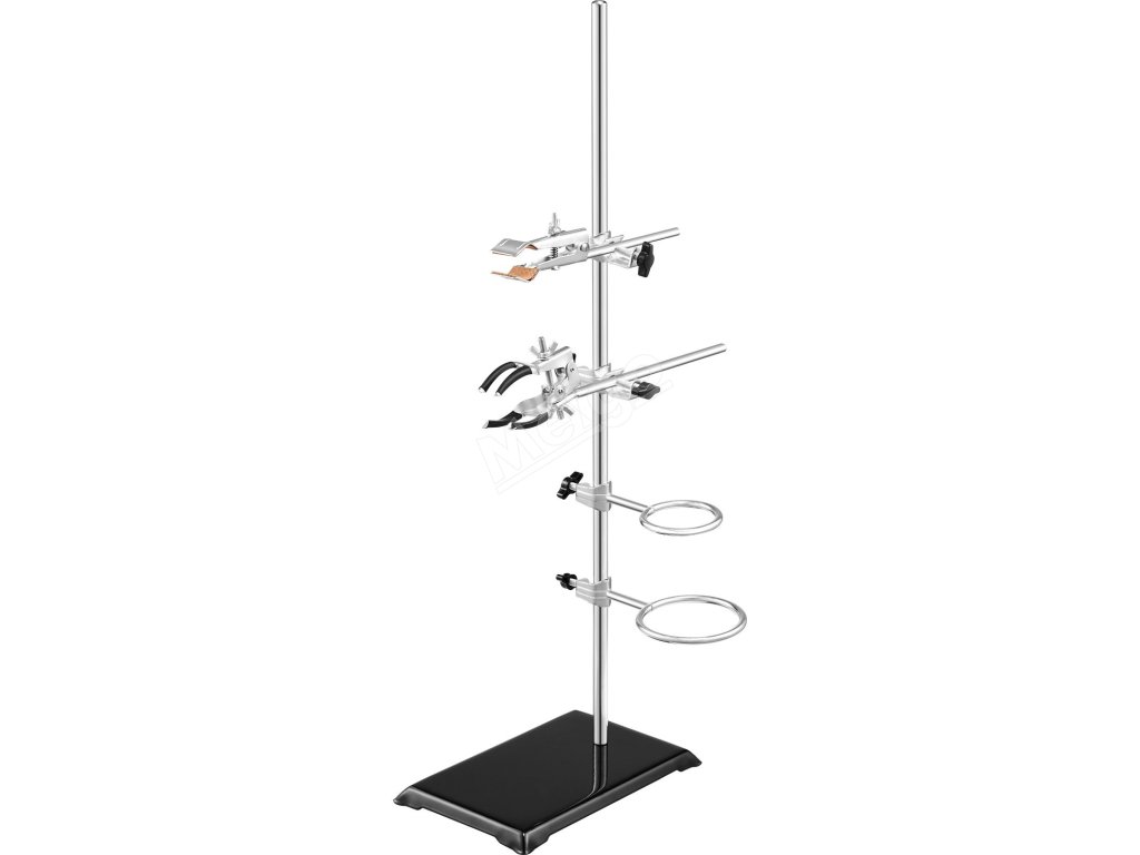 Náš podpěrný stojan vyrobený z nerezové oceli a litiny odolává vysokým teplotám a korozi, takže je možné jej používat dlouhodobě. Díky několika nastavitelným svorkám a retortovým kroužkům splní vaše rozmanité potřeby. Vyniká při filtraci, zahřívání a titračních pokusech.