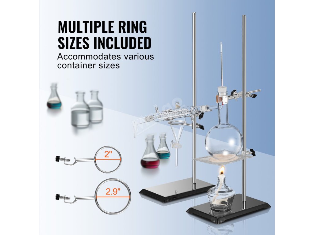 Výšku retortových kroužků lze libovolně nastavit podle potřeby experimentu, čímž se zajistí optimální poloha zkumavek nebo baněk pro destilační operace.