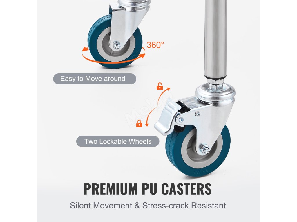 Čtyři 360° kolečka zajišťují snadnou mobilitu při přepravě těžkého vybavení. Kromě toho jsou součástí dodávky dvě kolečka s možností aretace, která zajišťují stabilitu.