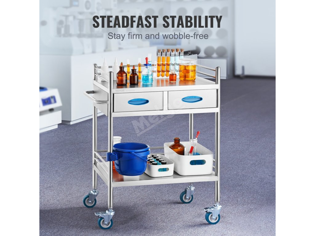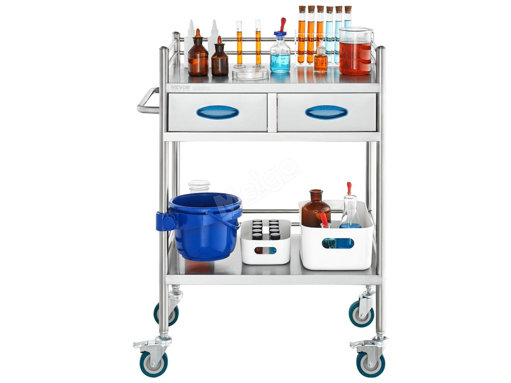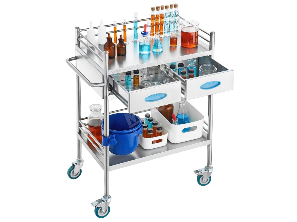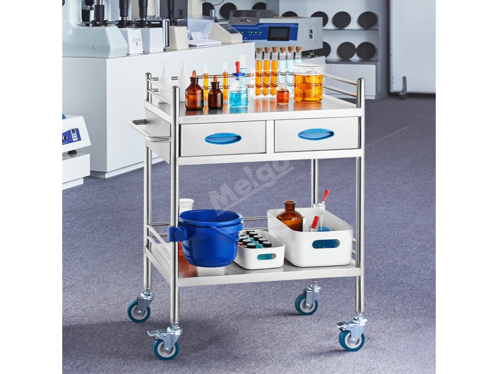 Laboratorní vozík z nerezové oceli unese až 220 kg. Tento laboratorní vozík je navržen se 2 policemi, které optimalizují vaše skladovací řešení.Hladký pohyb zajišťují 4 kolečka (2 uzamykatelná). Vhodný pro laboratoře, kliniky, SPA, kosmetické salony atd.