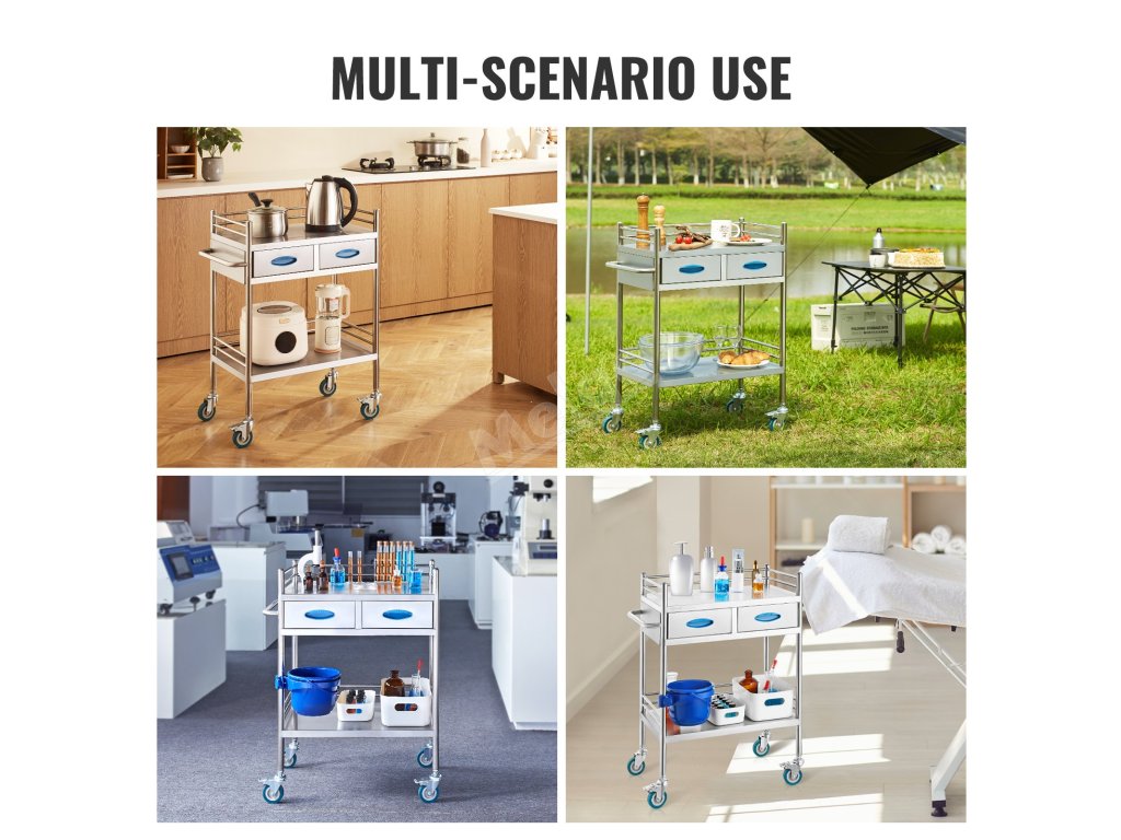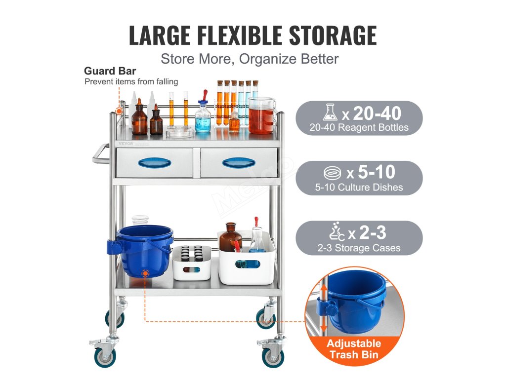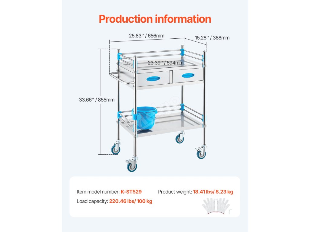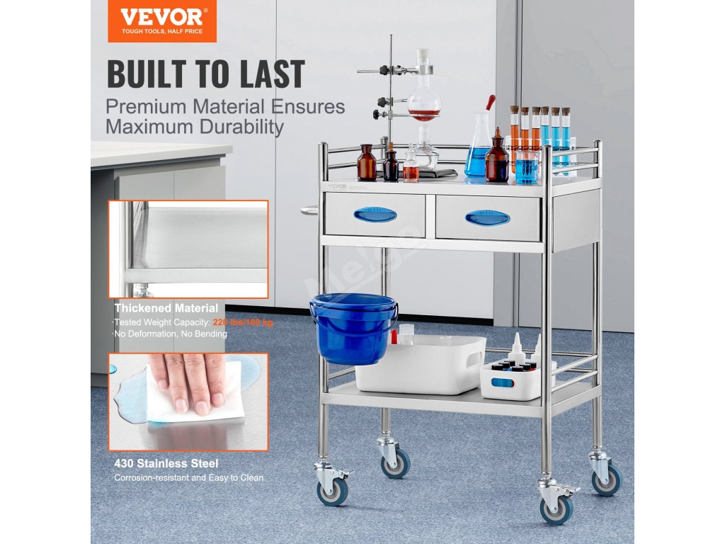 Laboratorní vozík z nerezové oceli unese až 220 kg. Tento laboratorní vozík je navržen se 2 policemi, které optimalizují vaše skladovací řešení.Hladký pohyb zajišťují 4 kolečka (2 uzamykatelná). Vhodný pro laboratoře, kliniky, SPA, kosmetické salony atd.