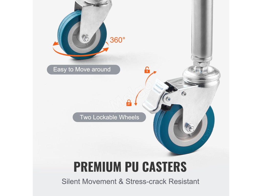 Čtyři 360° kolečka zajišťují snadnou mobilitu při přepravě těžkého vybavení. Kromě toho jsou součástí dodávky dvě kolečka s možností aretace, která zajišťují stabilitu.