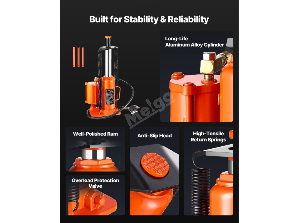 Tento ruční a pneumatický hydraulický zvedák lahví využívá hydraulickou sílu ke stabilnímu zvedání až 12 tun. Zvládne těžké úkoly, jako jsou opravy vozidel nebo domácí údržba vozů SUV, nákladních automobilů a pickupů.