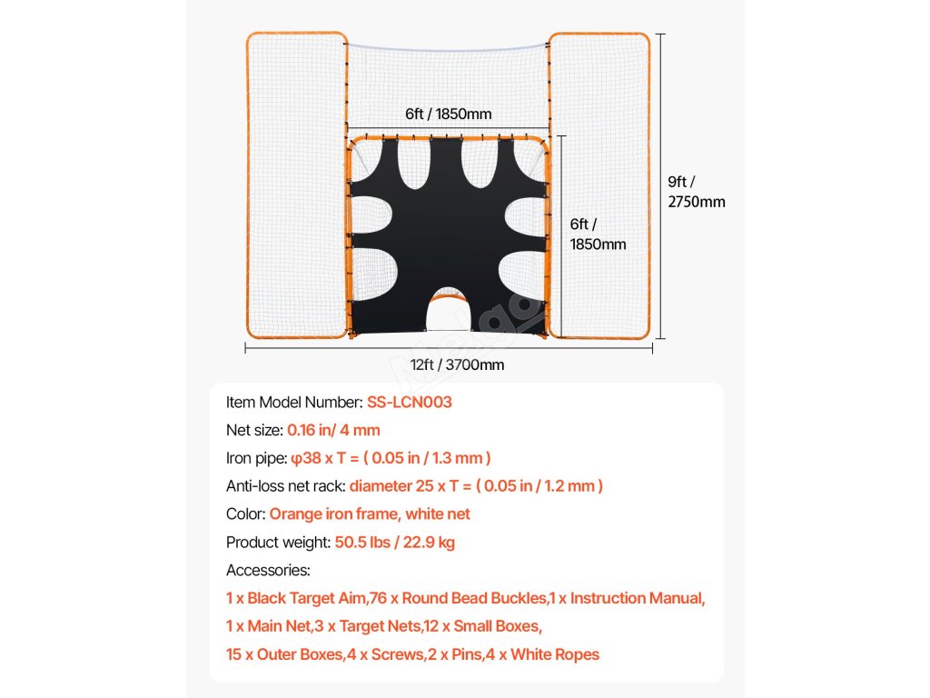 Tato branka na lakros na dvorku obsahuje síť, zábranu a terč. S celkovými rozměry 12 × 9 stop splňuje všechny tréninkové potřeby. Hodí se také k jinému vybavení nebo sportovištím stejného standardu, což zajišťuje kompatibilitu a zvyšuje její všestrannost a zaměnitelnost.