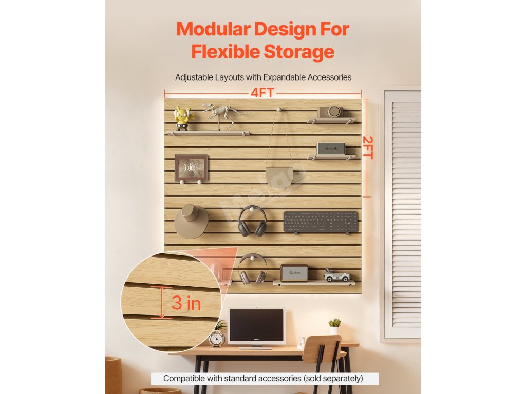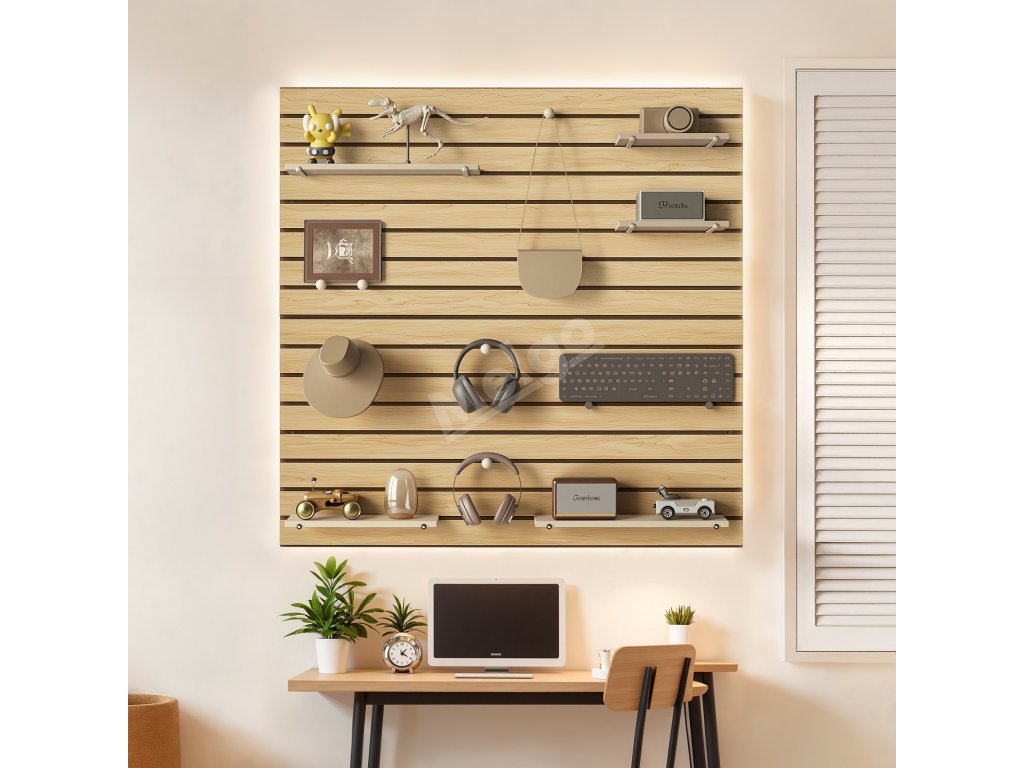 Tento lamelový stěnový panel se plně hodí do mnoha prostředí včetně domácností a obchodů, kde šetří místo, umožňuje efektivní skladování a stylové vystavení. Poskytne vám uklizený prostor!