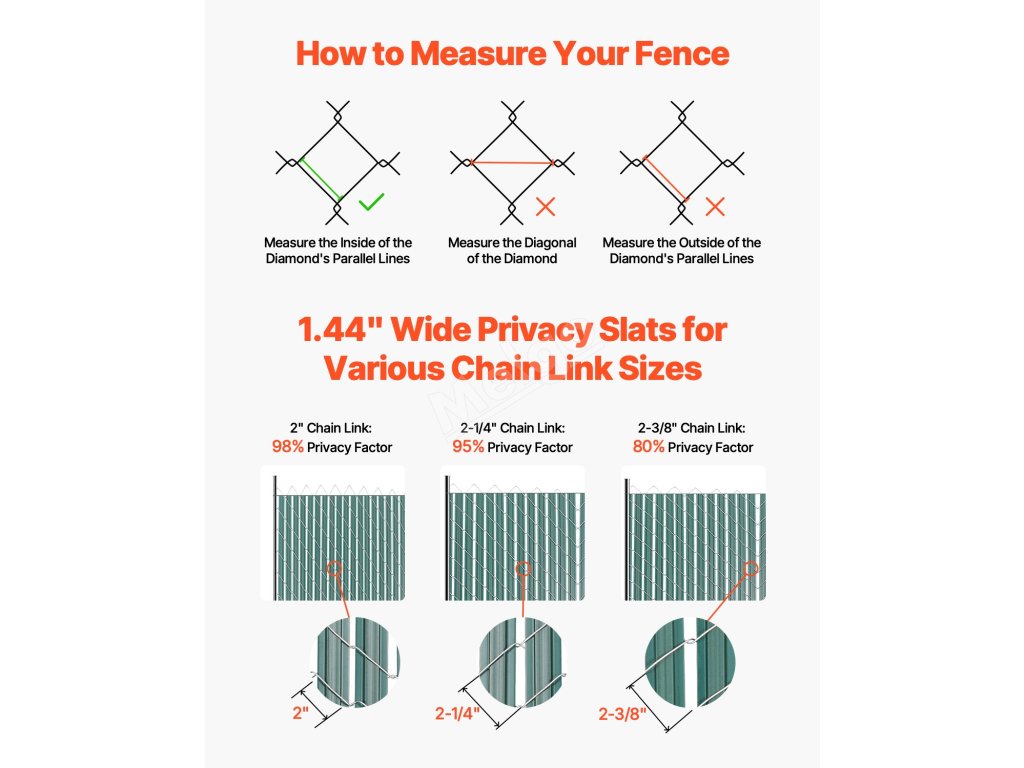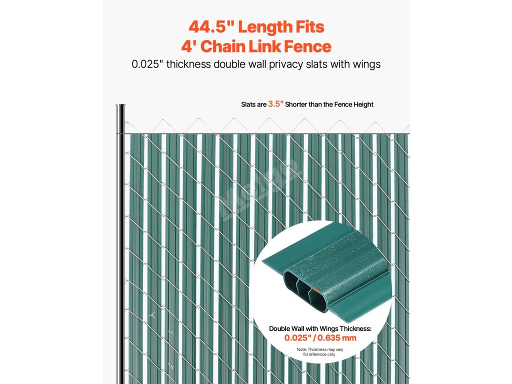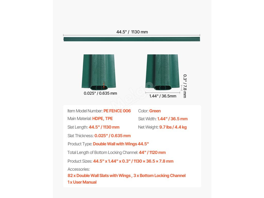 Tyto 44,5" lamely jsou určeny pro 4' vysoké ploty. Tyto lamely jsou vyrobeny z HDPE s vysokou hustotou, jsou odolné proti povětrnostním vlivům, trvanlivé a snadno se instalují. Každé balení obsahuje 82 lamel a 3 spodní zajišťovací kanály pro ploty o délce 10 stop, které zajišťují bezpečné a stabilní uchycení.