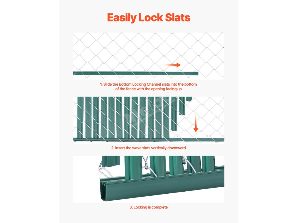 Spodní uzamykatelné lamely pro ochranu soukromí vyžadují pouze tři jednoduché kroky. Nejprve vložte spodní lamely s uzamykacím kanálem do základny plotu. Poté posuňte lamely pro ochranu soukromí svisle dolů a zajistěte je ve spodním kanálu. Díky tomu je dokončení instalace plotu snadné.