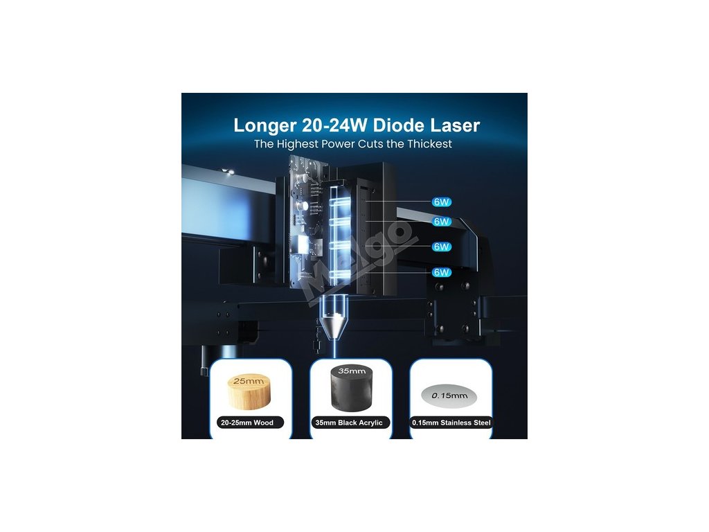 Díky nejmodernější technologii šestijádrového laseru má 20W laser B1 silný optický výstupní výkon 20-24 W, což je jeden z nejvýkonnějších diodových laserů, které jsou dnes k dispozici, a tím i mnohem silnější řezné schopnosti. Laser B1 20W dokáže řezat 15mm borovicové dřevo, 8mm černý akrylát a dokonce i 0,1mm nerezovou ocel na jeden průchod, 20mm basové dřevo a 35mm černý akrylát na více průchodů.