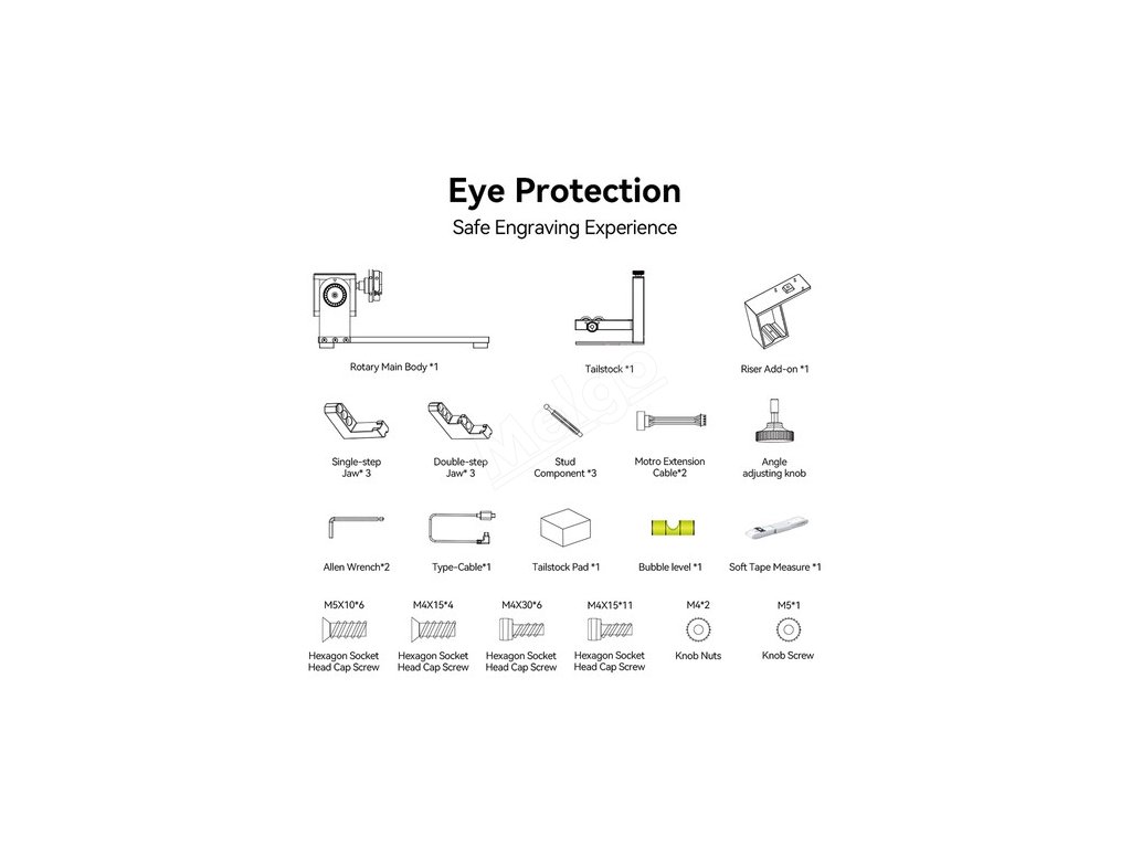 | Obsah balení | 1 x hlavní otočné těleso 1 x kůň 1 x přídavný stojan 3 x jednostupňová čelist 3 x dvoustupňová čelist 3 x pinová součástka 2 x prodlužovací kabel Motro 1 x rukojeť pro nastavení úhlu 2 x imbusový klíč 1 x typový kabel 1 x podložka pod koně 1 x Bublinková vodováha 1 x měkký svinovací metr 6 x šroub se šestihrannou hlavou M5X10 4 x šroub se šestihrannou hlavou M4X15 6 x šroub se šestihrannou hlavou M4X30 11 x šroub se šestihrannou hlavou M4X15 2 x matice M4 1 x šroub s knoflíkem M5 |