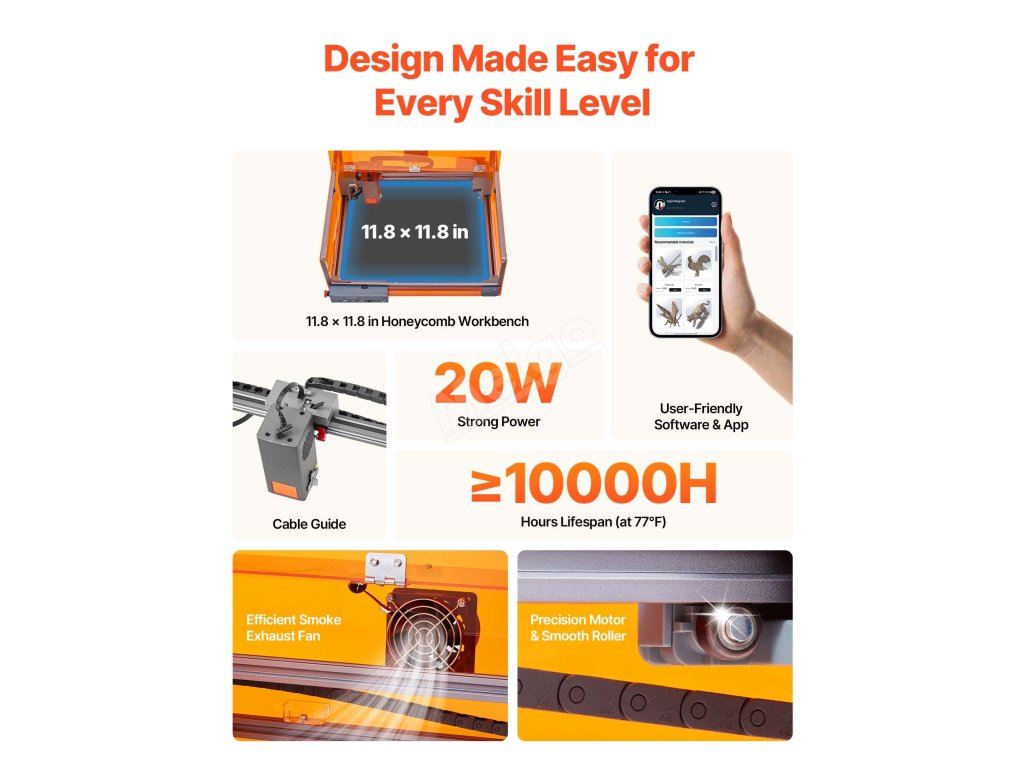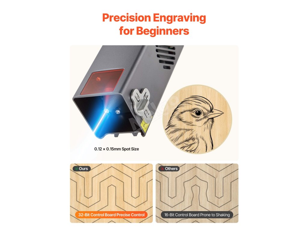 Popusťte uzdu své kreativitě díky pracovní ploše 11,8 x 11,8 palce a rychlosti gravírování 7000 mm/min. Na jeden průchod prořízněte 0,3 palce basového dřeva a dosáhněte jemných detailů pomocí modrého laserového bodu o rozměrech 0,12 x 0,15 mm. Je vybaven laserem třídy 1 a podporuje aplikace LaserGRBL, LightBurn (placená) a CutLabX APP.