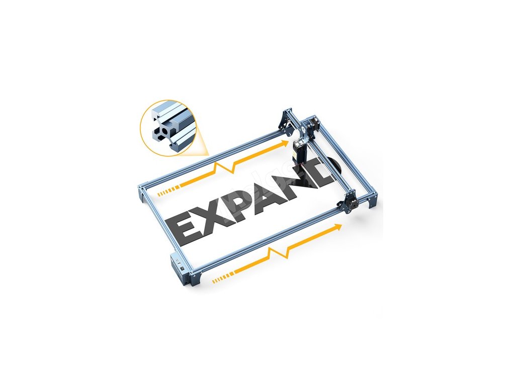 Díky celokovové konstrukci je laserový gravírovací stroj mimořádně robustní a zvyšuje přesnost gravírování. Montáž lze dokončit za 10 až 20 minut. Konstrukční rám je velmi odolný a zůstává otevřený pro modernizaci. Můžete jej nahradit jinými novými lasery. Nebo vyměnit delší kovové nosníky a rozšířit tak gravírovací plochu.