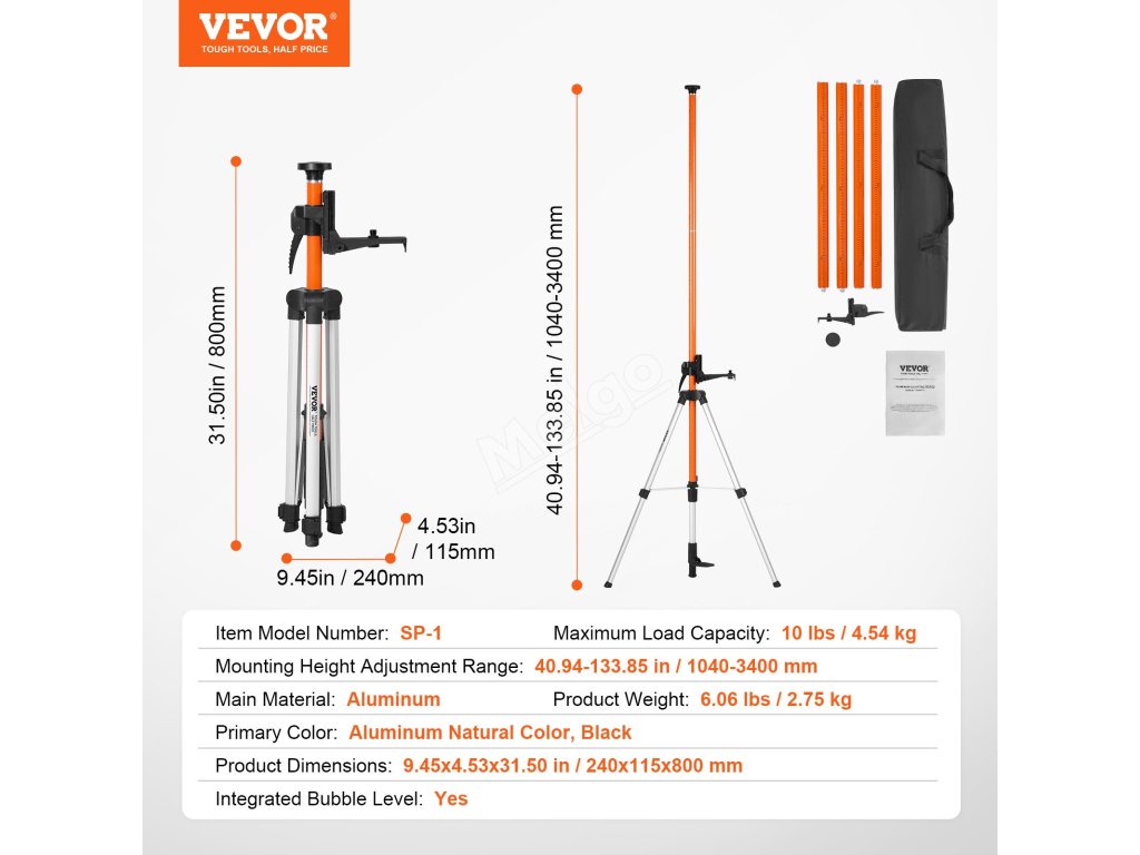 Stativ VEVOR je vyroben z prvotřídního hliníku, takže je pevný a odolný pro dlouhodobé používání bez opotřebení. Výška je nastavitelná tak, aby vyhovovala různým potřebám měření. Kompatibilní s liniovými lasery, bodovými lasery a laserovými měřiči vzdálenosti, které se hojně používají ve stavebnictví a při zařizování interiérů.