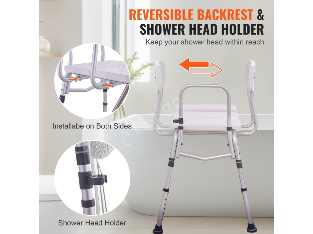 Žádné další nástroje nejsou potřeba! Koupelnové židle pro seniory můžete nastavit rychle a bez námahy. Díky přiloženému držáku sprchové hlavice budete mít sprchovou hlavici pohodlně na dosah. Opěradlo je navíc oboustranné, takže jej můžete nainstalovat na obě strany tak, aby vyhovovalo vašemu nastavení sprchy.