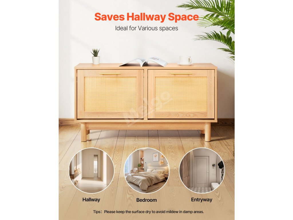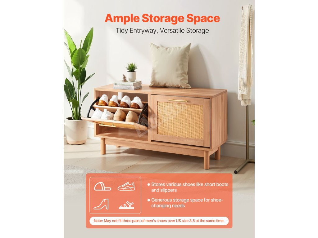 Tento dřevěný botník se hodí do vstupních prostor, obývacích pokojů nebo na dveře ložnic. Na horní plochu lze umístit malé rostliny nebo dekorativní předměty, což zvyšuje funkčnost i vzhled. Dodá vašemu prostoru teplo a pohodlí a stane se okouzlující dominantou místnosti.