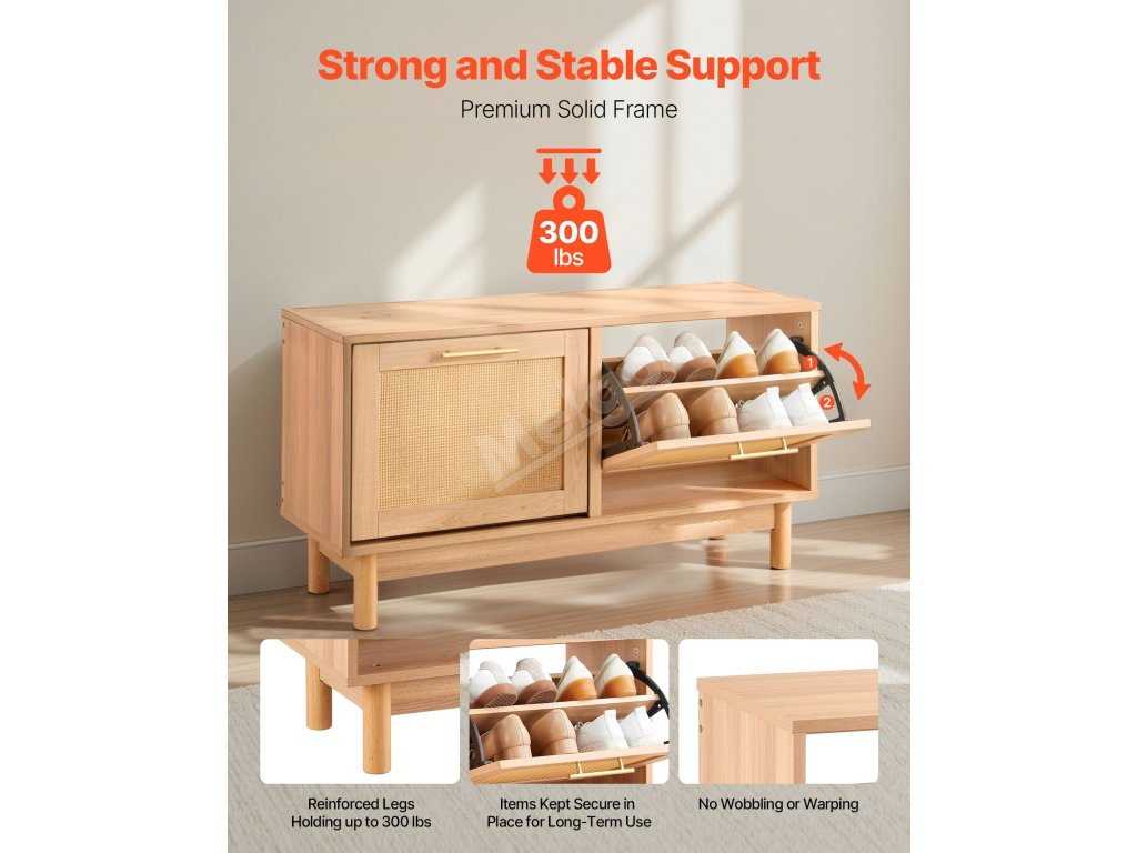 Naše lavice na boty má pevnou a stabilní konstrukci s vynikající nosností. Snadno unese více sedících osob při přezouvání, aniž by se deformovala nebo poškodila, a zároveň poskytuje spolehlivou a dlouhotrvající oporu.