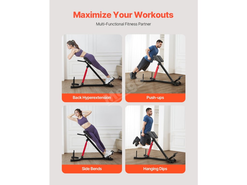 Tato římská židle vám pomůže procvičit celé tělo, od paží a zad až po hrudník, hýždě, hamstringy a jádro těla. Je to váš univerzální fitness partner pro komplexní trénink.
